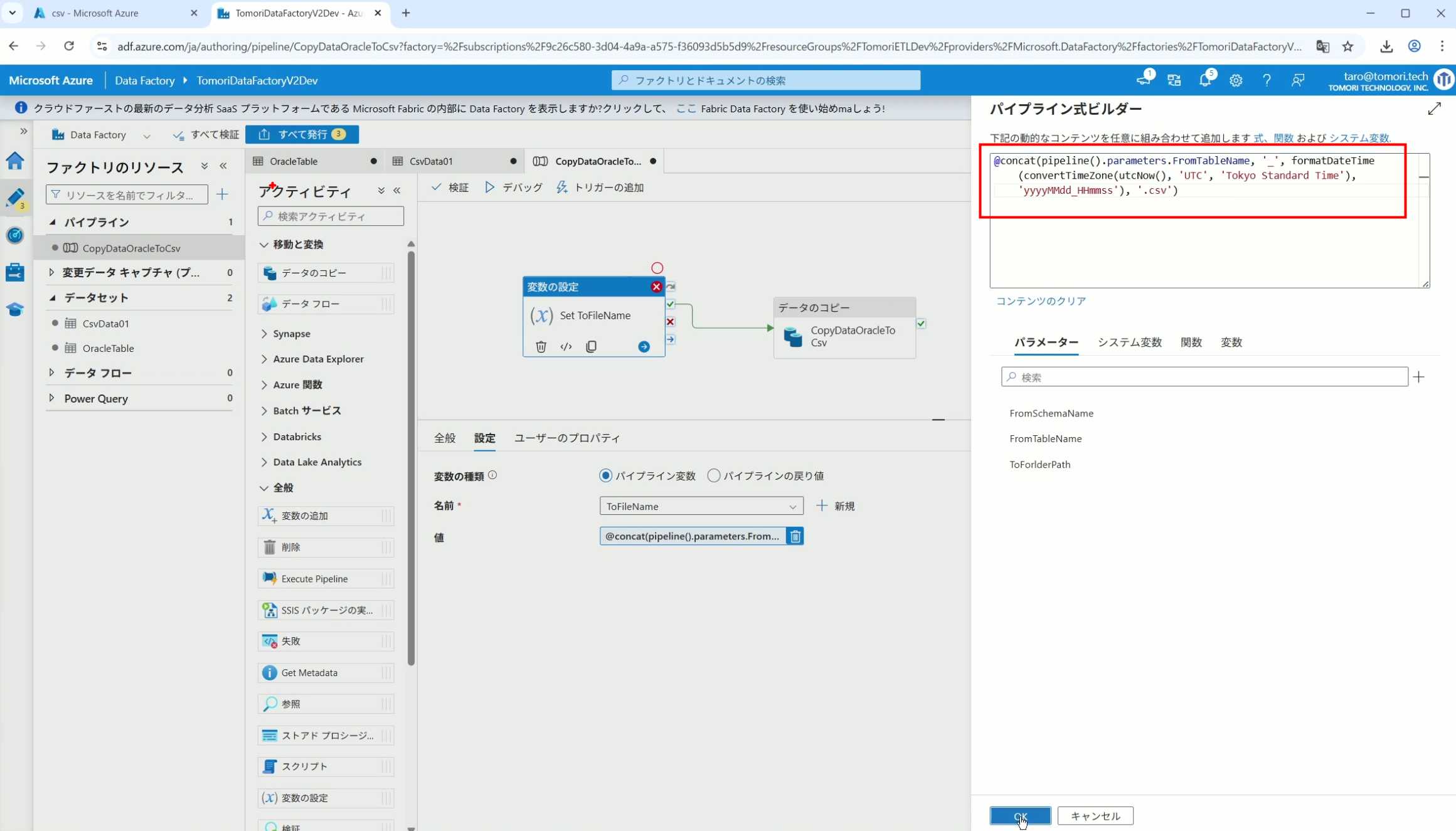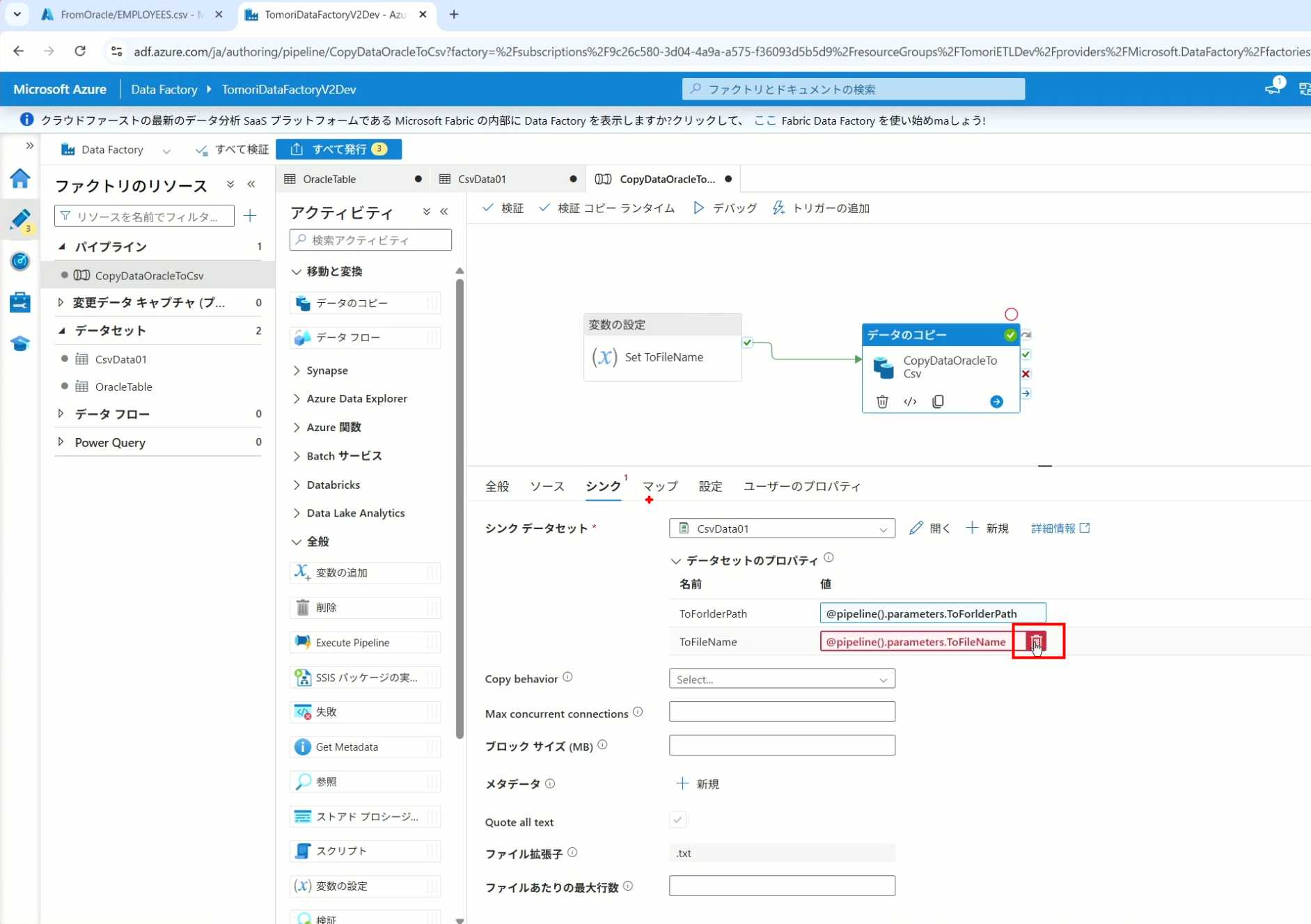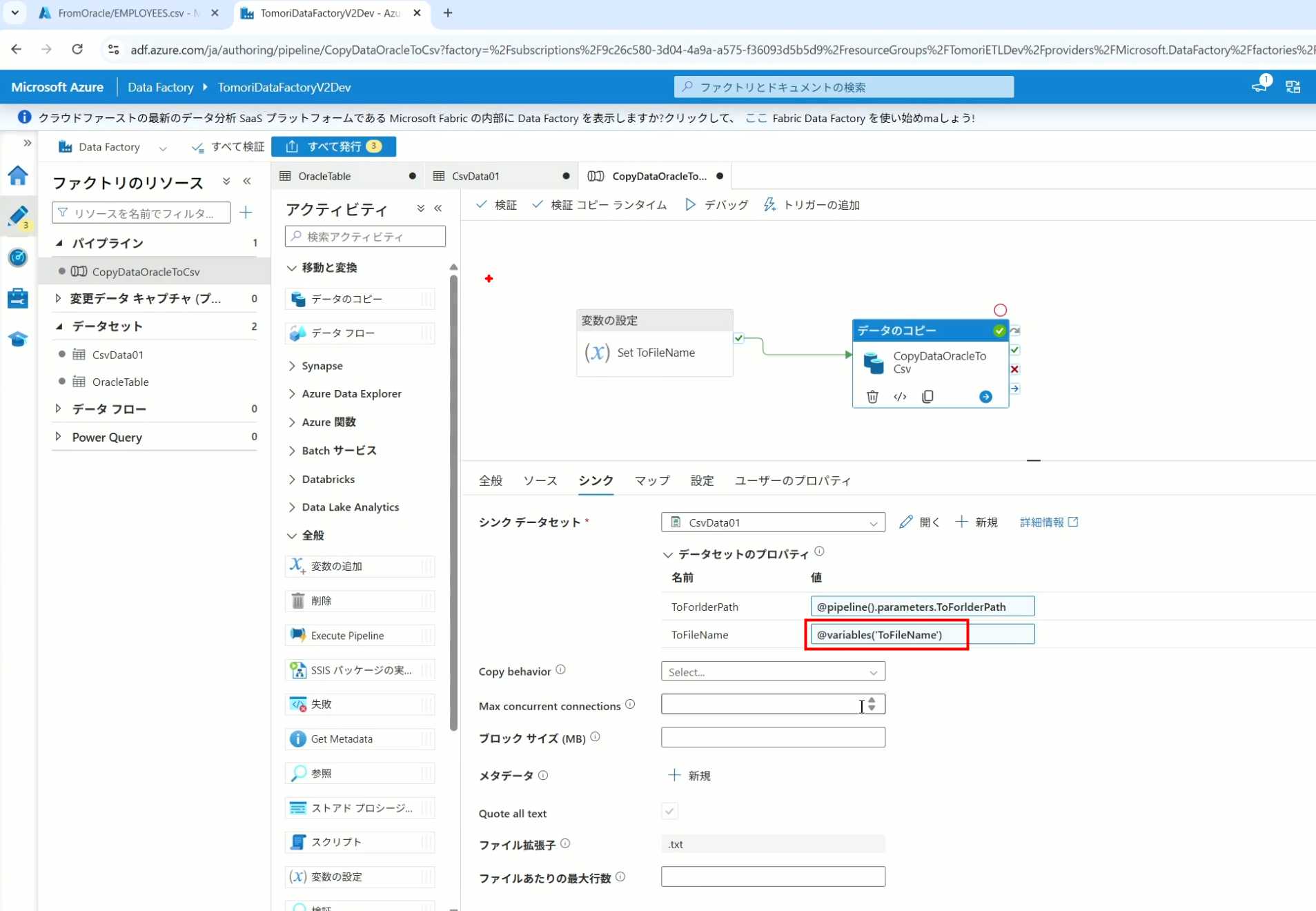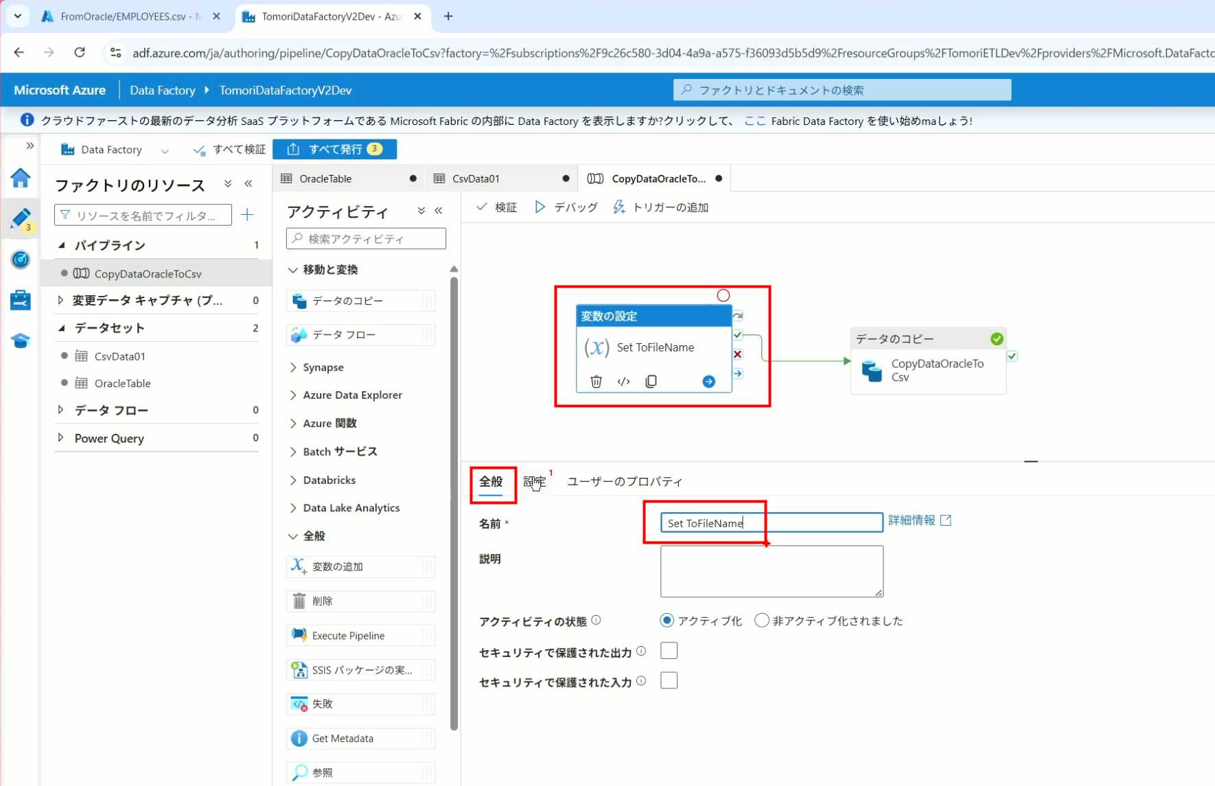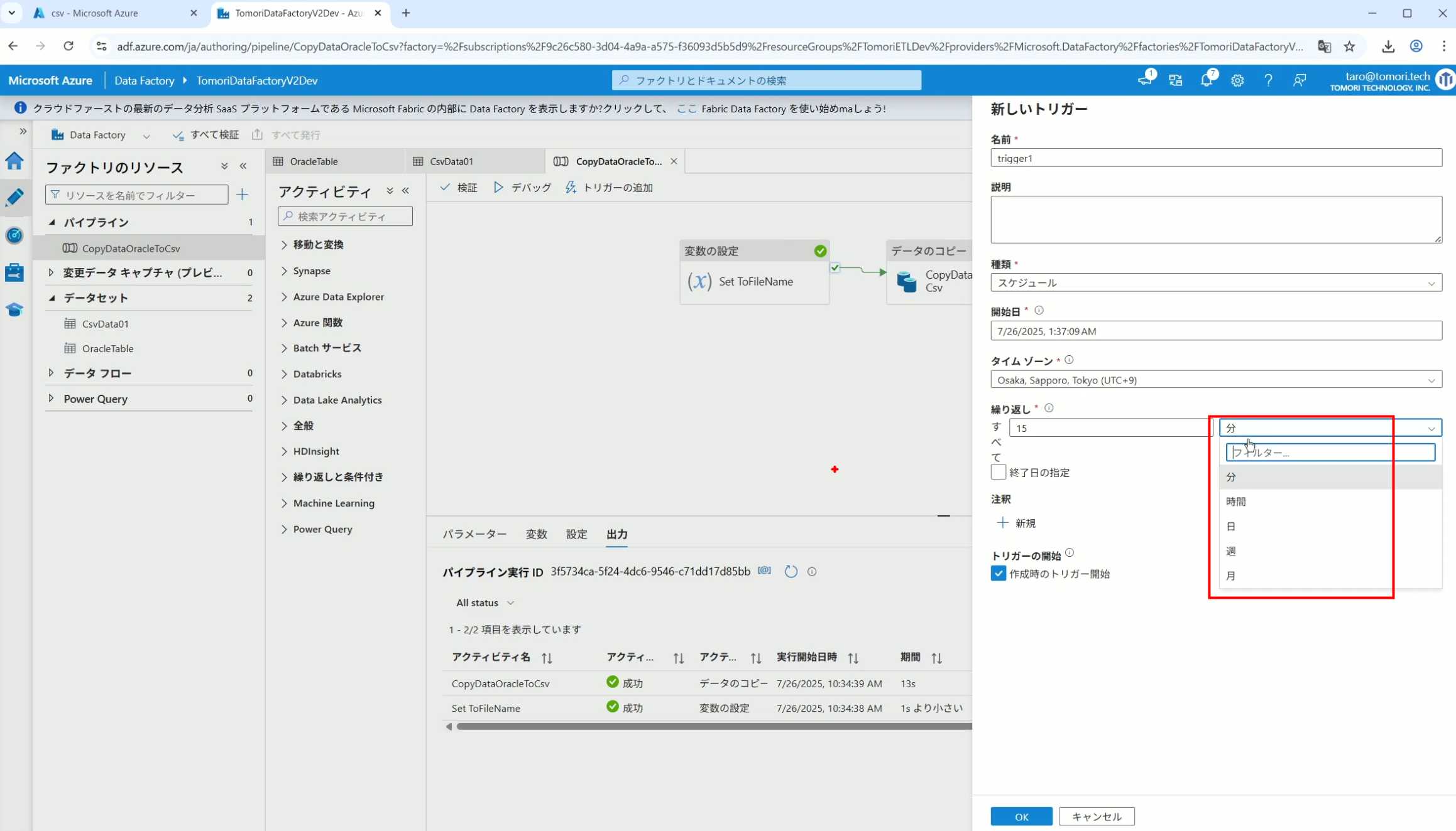 08_创建和使用ADF-03_在Pipeline中使用参数和变量以及Trigger执行 发布时间:2025-09-28 最后更新:2025-10-13 Azure 11 1、我们可以在Pipeline的参数中添加参数,以及设置参数的初始值,这样就可以通过参数来动态控制从哪个表获取数据,将数据保存成什么文件 2、Oracle的Dataset中也添加参数 3、Dataset中的Schema名和表名改用参数 4、点击参数即可使用(参数会跳到上面的编辑栏里) 5、同样,Storage的Dataset里也添加参数 6、保存文件的路径,文件名都设置为使用参数 7、在Copy Activity的Source里,将Pipeline的参数传递给Oracle的Dataset 8、设置好的样子 9、在Copy Activity的Sink中,将Pipeline的参数传递给Storage的Dataset 10、再以Debug模式运行Pipeline,这时就会出现参数框,因为我们设置了默认值,所以在里不需要再设置,如果没有设置默认值,可以在这里填入参数值 11、查看运行结果(成功) 12、修改默认参数值,再次运行 13、转到Storage,可以看到,文件以我们设置的参数值生成了 14、揭下来,我们给Pipeline添加一个变量 15、从左边的Activity一览里拖入设置变量的Activity 16、将两个Activity用绿线连起来(绿线代表前一个执行成功时,下一个接着执行,红线代表前一个执行失败时,下一个接着执行) 17、对设置变量的Activity进行设置,修改Activity的名字 18、对设置变量的Activity进行设置,给变量添加一个值,值可以是手写,也可以选择Pipeline的参数 19、当我们想在编辑框里手动编辑时,要符合代码的语法才行,如果不符合语法汇报错,比如想在变量后面加个「.csv」的话,不能直接添加 20、在Data Factory提供的函数中,可以选择concat,当鼠标停留在上面时,会显示函数的作用,concat是将多个字符串连接到一起 21、使用了concat之后的设置(符合语法,不会报错) 22、比如我们可以将Sink的文件名删掉 23、改用变量 24、设置好使用变量的样子 25、还可以对文件名进行编辑,比如加一个时间后缀,这里选择使用utcNow函数和formatDataTime函数,将当前时间转换为yyyyMMddHHmmss格式 26、再次执行Pipeline,执行成功后,在Storage里可以看到,文件以带有时间后缀的形式生成了 27、也可以使用convertTimeZone函数,将当前utc时间转换为日本时间 28、再次执行Pipeline,执行成功后,在Storage里可以看到,文件以带有时间后缀的形式生成了,并且时间是日本时间 29、发行Pipeline 30、确认Pipeline的修改点,没有问题的话点击发行 31、按照图示,可以点击Trigger执行→马上Trigger 32、弹出参数框,因为设置了默认参数,这里不需要再设置,点击OK 33、转到监视界面,可以看到Trigger执行的执行结果 34、点击Pipeline,进入到详细结果界面,可以查看Activity的输入和输出,比如点击输入按钮 35、可以看到输入的参数 36、点击输出按钮 37、可以查看输出的参数 38、在Copy Activity中,有一个眼镜按钮,点击眼镜按钮 39、可以查看数据复制的详细信息,读了多少行,读了多少Size,写了多少Size,用时多少等等 40、在Trigger执行中,还可以设置定期的自动执行 41、选择新建 42、可以选择按天,按小时,按分钟执行等 43、比如选择了按天的话,可以设置每天固定的时间自动执行