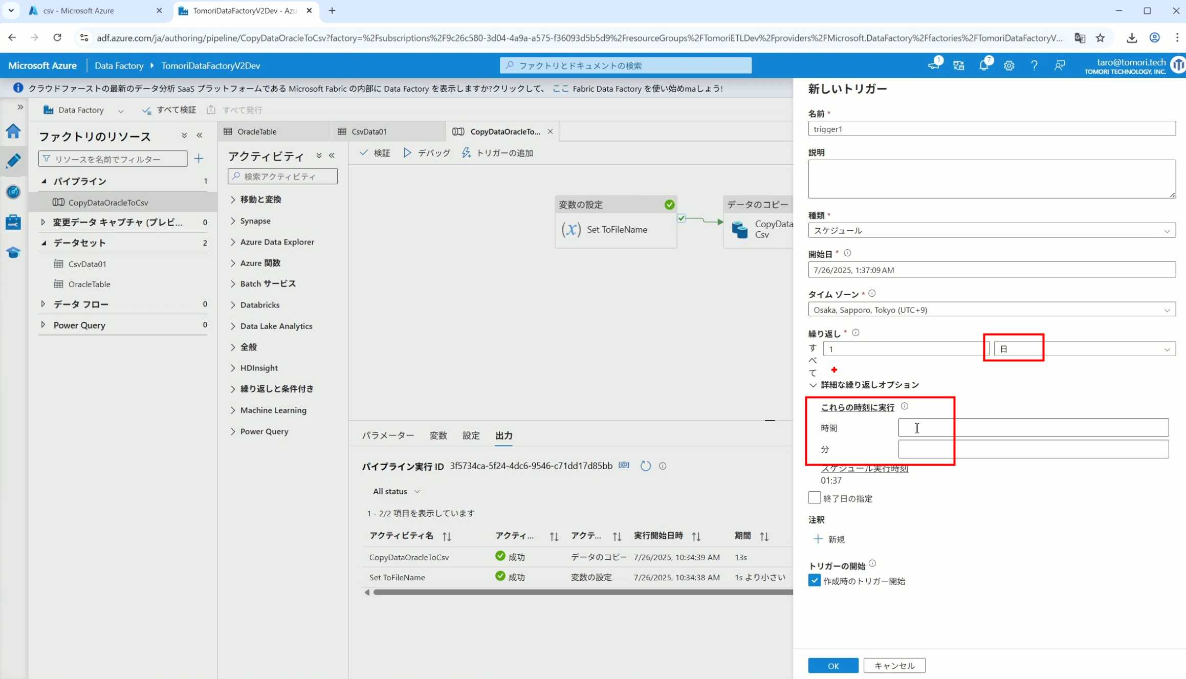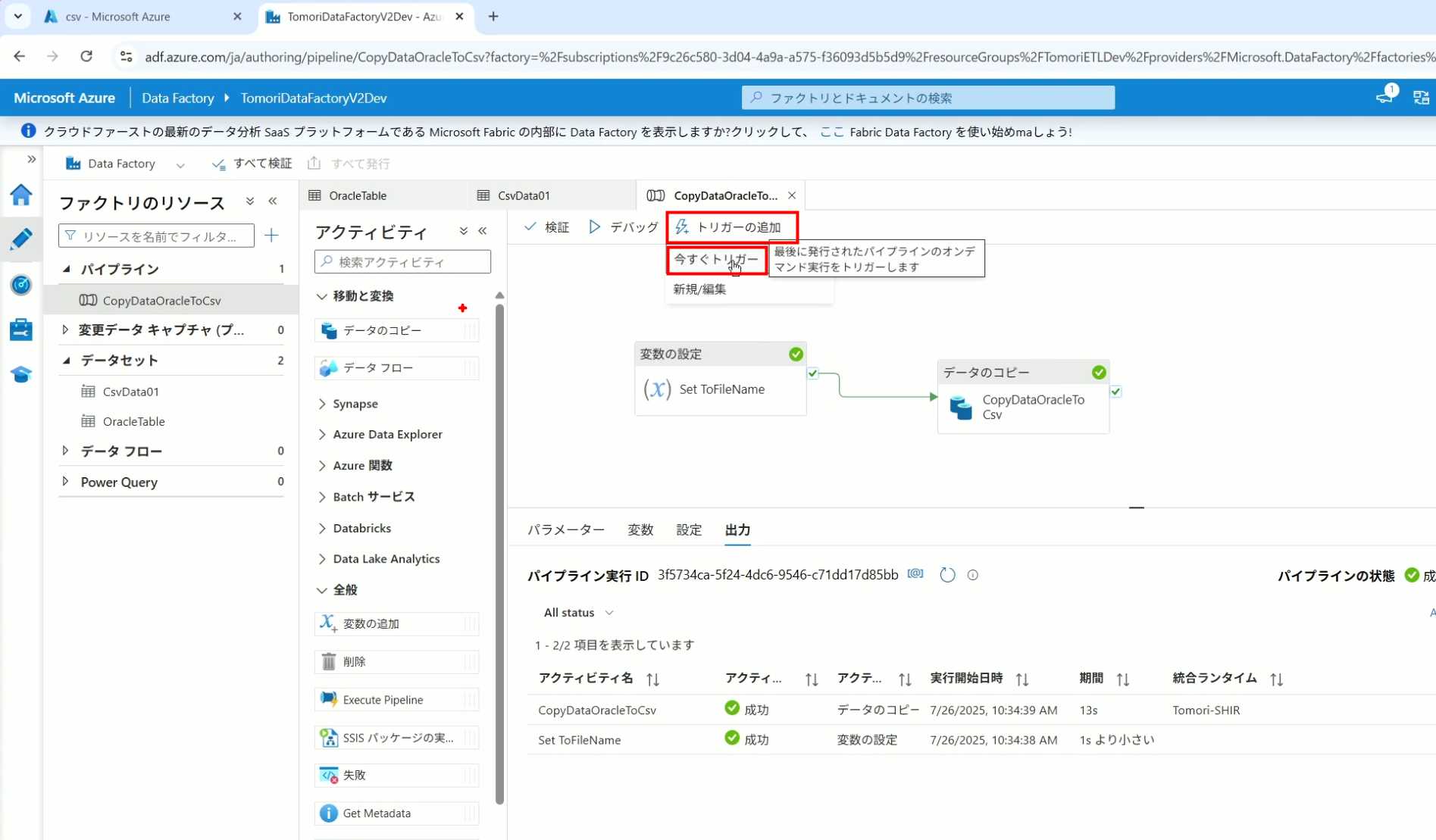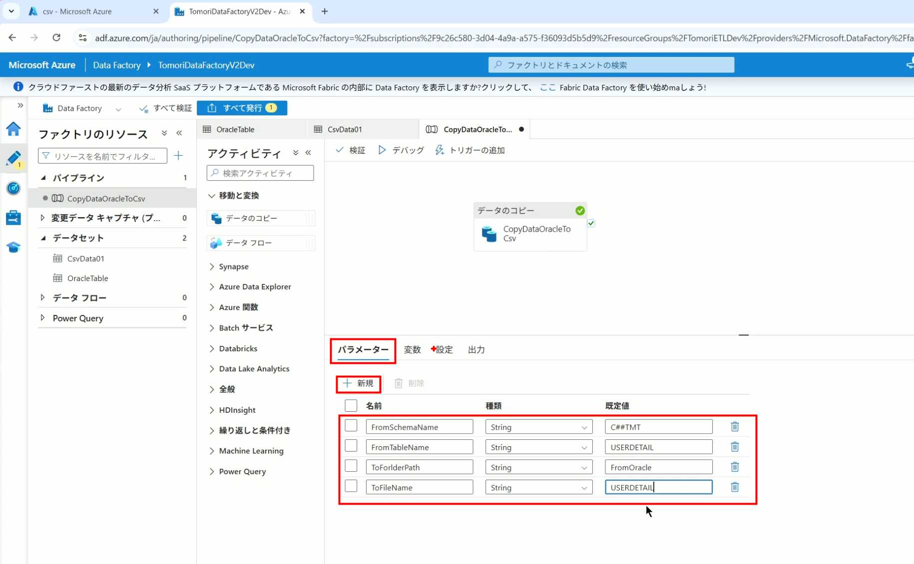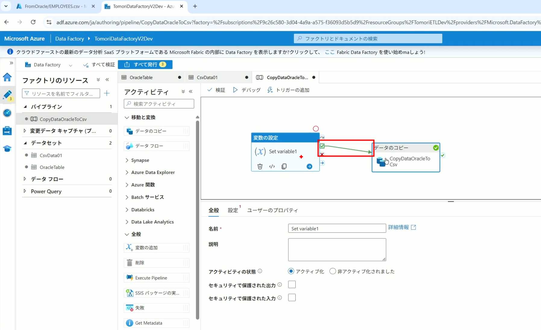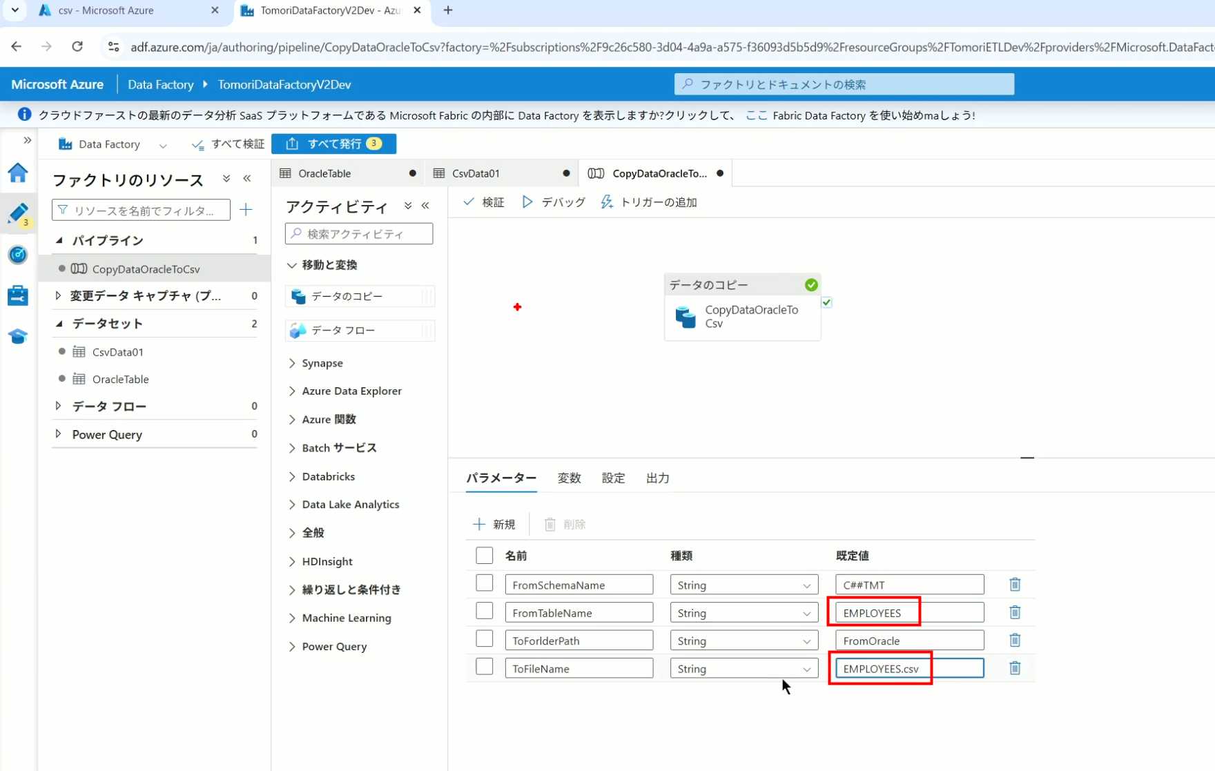 08_创建和使用ADF-03_在Pipeline中使用参数和变量以及Trigger执行 发布时间:2025-09-28 最后更新:2025-10-13 Azure 11 1、我们可以在Pipeline的参数中添加参数,以及设置参数的初始值,这样就可以通过参数来动态控制从哪个表获取数据,将数据保存成什么文件 2、Oracle的Dataset中也添加参数 3、Dataset中的Schema名和表名改用参数 4、点击参数即可使用(参数会跳到上面的编辑栏里) 5、同样,Storage的Dataset里也添加参数 6、保存文件的路径,文件名都设置为使用参数 7、在Copy Activity的Source里,将Pipeline的参数传递给Oracle的Dataset 8、设置好的样子 9、在Copy Activity的Sink中,将Pipeline的参数传递给Storage的Dataset 10、再以Debug模式运行Pipeline,这时就会出现参数框,因为我们设置了默认值,所以在里不需要再设置,如果没有设置默认值,可以在这里填入参数值 11、查看运行结果(成功) 12、修改默认参数值,再次运行 13、转到Storage,可以看到,文件以我们设置的参数值生成了 14、揭下来,我们给Pipeline添加一个变量 15、从左边的Activity一览里拖入设置变量的Activity 16、将两个Activity用绿线连起来(绿线代表前一个执行成功时,下一个接着执行,红线代表前一个执行失败时,下一个接着执行) 17、对设置变量的Activity进行设置,修改Activity的名字 18、对设置变量的Activity进行设置,给变量添加一个值,值可以是手写,也可以选择Pipeline的参数 19、当我们想在编辑框里手动编辑时,要符合代码的语法才行,如果不符合语法汇报错,比如想在变量后面加个「.csv」的话,不能直接添加 20、在Data Factory提供的函数中,可以选择concat,当鼠标停留在上面时,会显示函数的作用,concat是将多个字符串连接到一起 21、使用了concat之后的设置(符合语法,不会报错) 22、比如我们可以将Sink的文件名删掉 23、改用变量 24、设置好使用变量的样子 25、还可以对文件名进行编辑,比如加一个时间后缀,这里选择使用utcNow函数和formatDataTime函数,将当前时间转换为yyyyMMddHHmmss格式 26、再次执行Pipeline,执行成功后,在Storage里可以看到,文件以带有时间后缀的形式生成了 27、也可以使用convertTimeZone函数,将当前utc时间转换为日本时间 28、再次执行Pipeline,执行成功后,在Storage里可以看到,文件以带有时间后缀的形式生成了,并且时间是日本时间 29、发行Pipeline 30、确认Pipeline的修改点,没有问题的话点击发行 31、按照图示,可以点击Trigger执行→马上Trigger 32、弹出参数框,因为设置了默认参数,这里不需要再设置,点击OK 33、转到监视界面,可以看到Trigger执行的执行结果 34、点击Pipeline,进入到详细结果界面,可以查看Activity的输入和输出,比如点击输入按钮 35、可以看到输入的参数 36、点击输出按钮 37、可以查看输出的参数 38、在Copy Activity中,有一个眼镜按钮,点击眼镜按钮 39、可以查看数据复制的详细信息,读了多少行,读了多少Size,写了多少Size,用时多少等等 40、在Trigger执行中,还可以设置定期的自动执行 41、选择新建 42、可以选择按天,按小时,按分钟执行等 43、比如选择了按天的话,可以设置每天固定的时间自动执行
