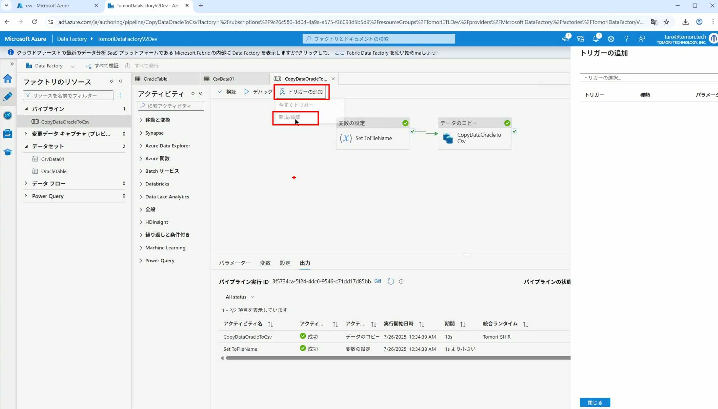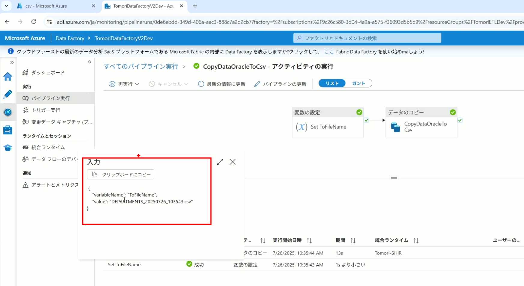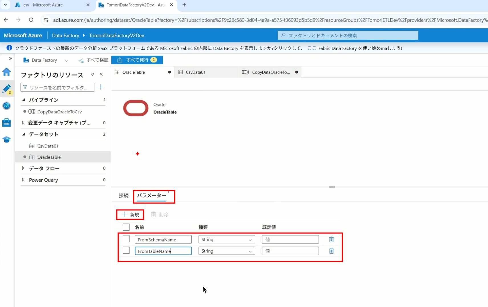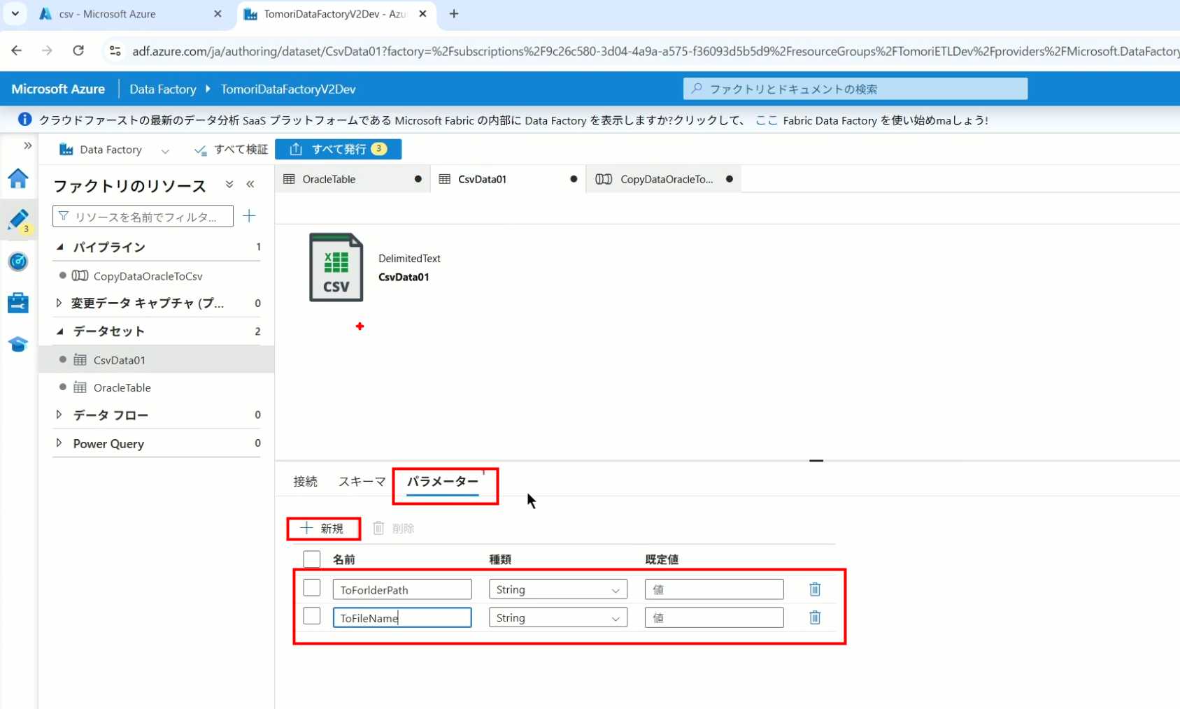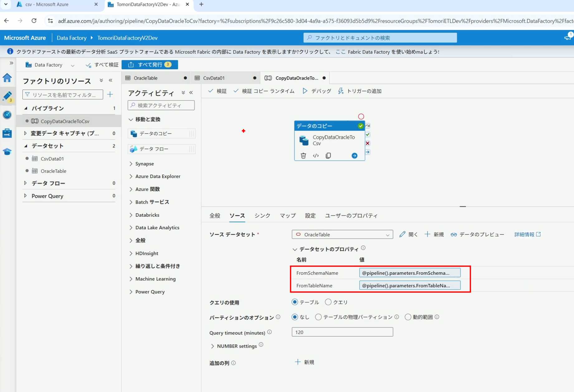 08_创建和使用ADF-03_在Pipeline中使用参数和变量以及Trigger执行 发布时间:2025-09-28 最后更新:2025-10-13 Azure 11 1、我们可以在Pipeline的参数中添加参数,以及设置参数的初始值,这样就可以通过参数来动态控制从哪个表获取数据,将数据保存成什么文件 2、Oracle的Dataset中也添加参数 3、Dataset中的Schema名和表名改用参数 4、点击参数即可使用(参数会跳到上面的编辑栏里) 5、同样,Storage的Dataset里也添加参数 6、保存文件的路径,文件名都设置为使用参数 7、在Copy Activity的Source里,将Pipeline的参数传递给Oracle的Dataset 8、设置好的样子 9、在Copy Activity的Sink中,将Pipeline的参数传递给Storage的Dataset 10、再以Debug模式运行Pipeline,这时就会出现参数框,因为我们设置了默认值,所以在里不需要再设置,如果没有设置默认值,可以在这里填入参数值 11、查看运行结果(成功) 12、修改默认参数值,再次运行 13、转到Storage,可以看到,文件以我们设置的参数值生成了 14、揭下来,我们给Pipeline添加一个变量 15、从左边的Activity一览里拖入设置变量的Activity 16、将两个Activity用绿线连起来(绿线代表前一个执行成功时,下一个接着执行,红线代表前一个执行失败时,下一个接着执行) 17、对设置变量的Activity进行设置,修改Activity的名字 18、对设置变量的Activity进行设置,给变量添加一个值,值可以是手写,也可以选择Pipeline的参数 19、当我们想在编辑框里手动编辑时,要符合代码的语法才行,如果不符合语法汇报错,比如想在变量后面加个「.csv」的话,不能直接添加 20、在Data Factory提供的函数中,可以选择concat,当鼠标停留在上面时,会显示函数的作用,concat是将多个字符串连接到一起 21、使用了concat之后的设置(符合语法,不会报错) 22、比如我们可以将Sink的文件名删掉 23、改用变量 24、设置好使用变量的样子 25、还可以对文件名进行编辑,比如加一个时间后缀,这里选择使用utcNow函数和formatDataTime函数,将当前时间转换为yyyyMMddHHmmss格式 26、再次执行Pipeline,执行成功后,在Storage里可以看到,文件以带有时间后缀的形式生成了 27、也可以使用convertTimeZone函数,将当前utc时间转换为日本时间 28、再次执行Pipeline,执行成功后,在Storage里可以看到,文件以带有时间后缀的形式生成了,并且时间是日本时间 29、发行Pipeline 30、确认Pipeline的修改点,没有问题的话点击发行 31、按照图示,可以点击Trigger执行→马上Trigger 32、弹出参数框,因为设置了默认参数,这里不需要再设置,点击OK 33、转到监视界面,可以看到Trigger执行的执行结果 34、点击Pipeline,进入到详细结果界面,可以查看Activity的输入和输出,比如点击输入按钮 35、可以看到输入的参数 36、点击输出按钮 37、可以查看输出的参数 38、在Copy Activity中,有一个眼镜按钮,点击眼镜按钮 39、可以查看数据复制的详细信息,读了多少行,读了多少Size,写了多少Size,用时多少等等 40、在Trigger执行中,还可以设置定期的自动执行 41、选择新建 42、可以选择按天,按小时,按分钟执行等 43、比如选择了按天的话,可以设置每天固定的时间自动执行