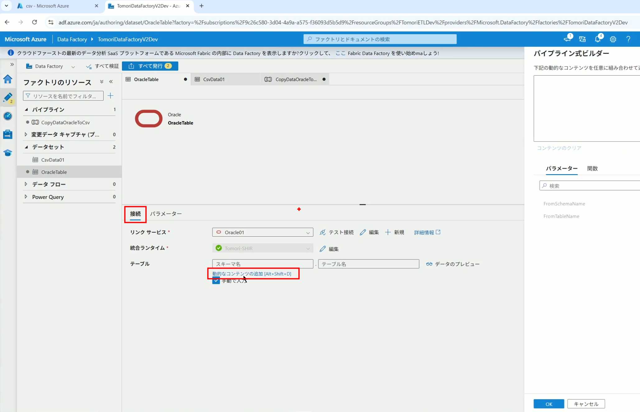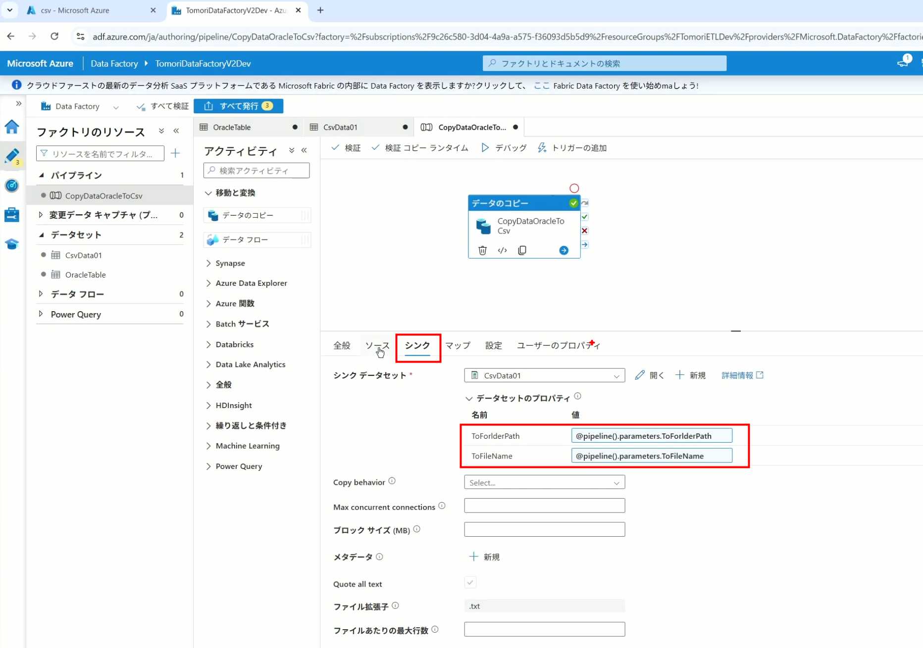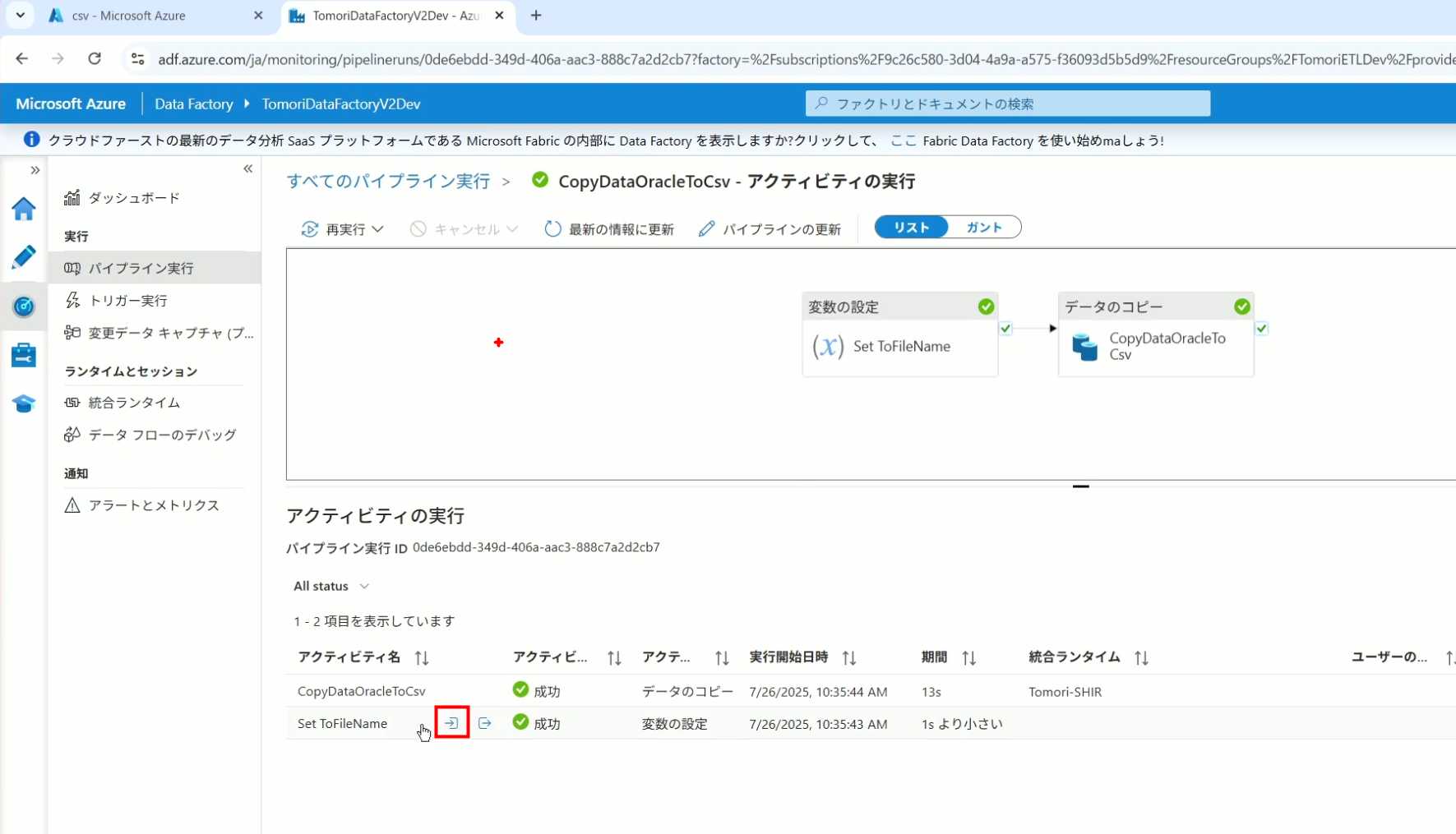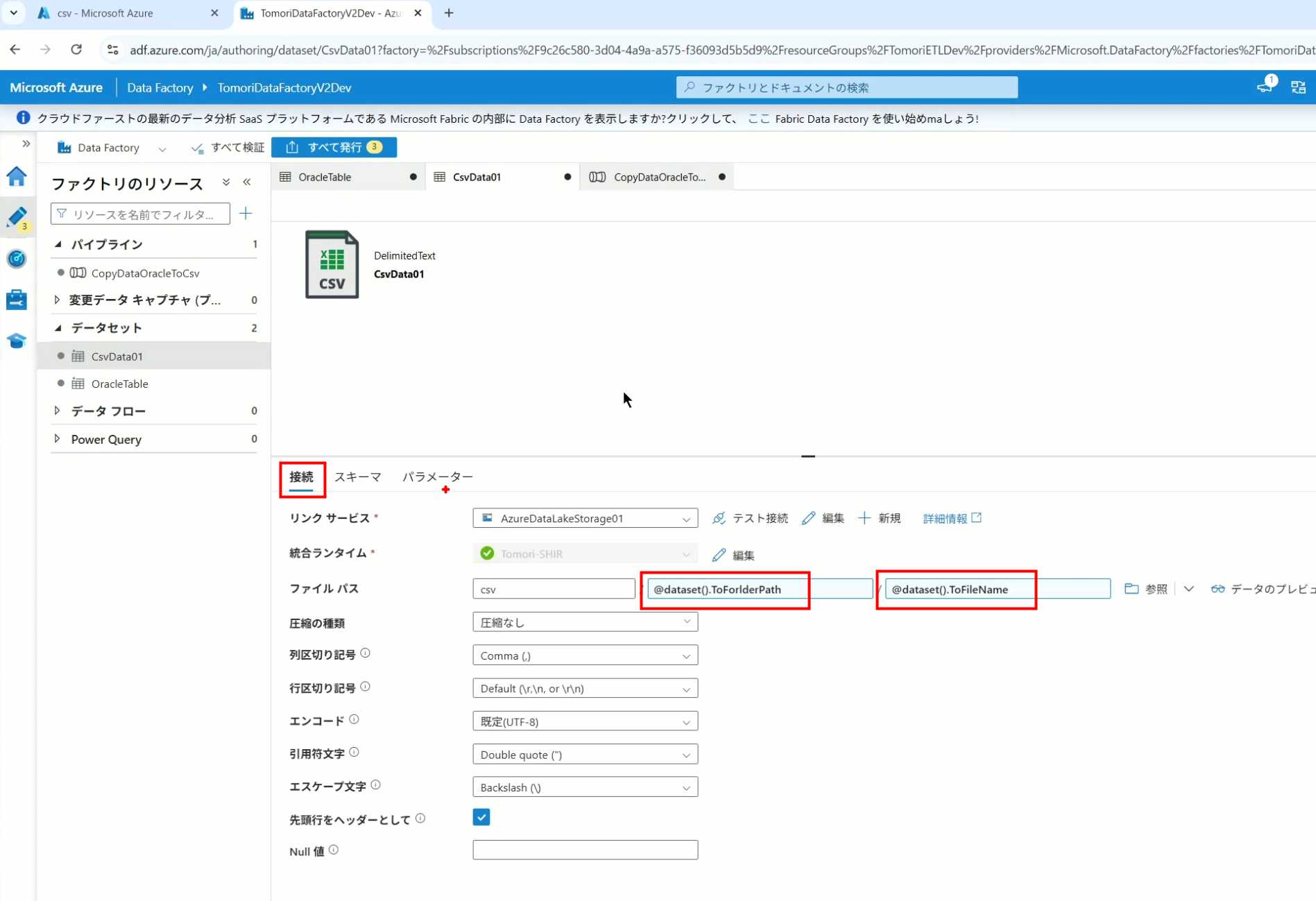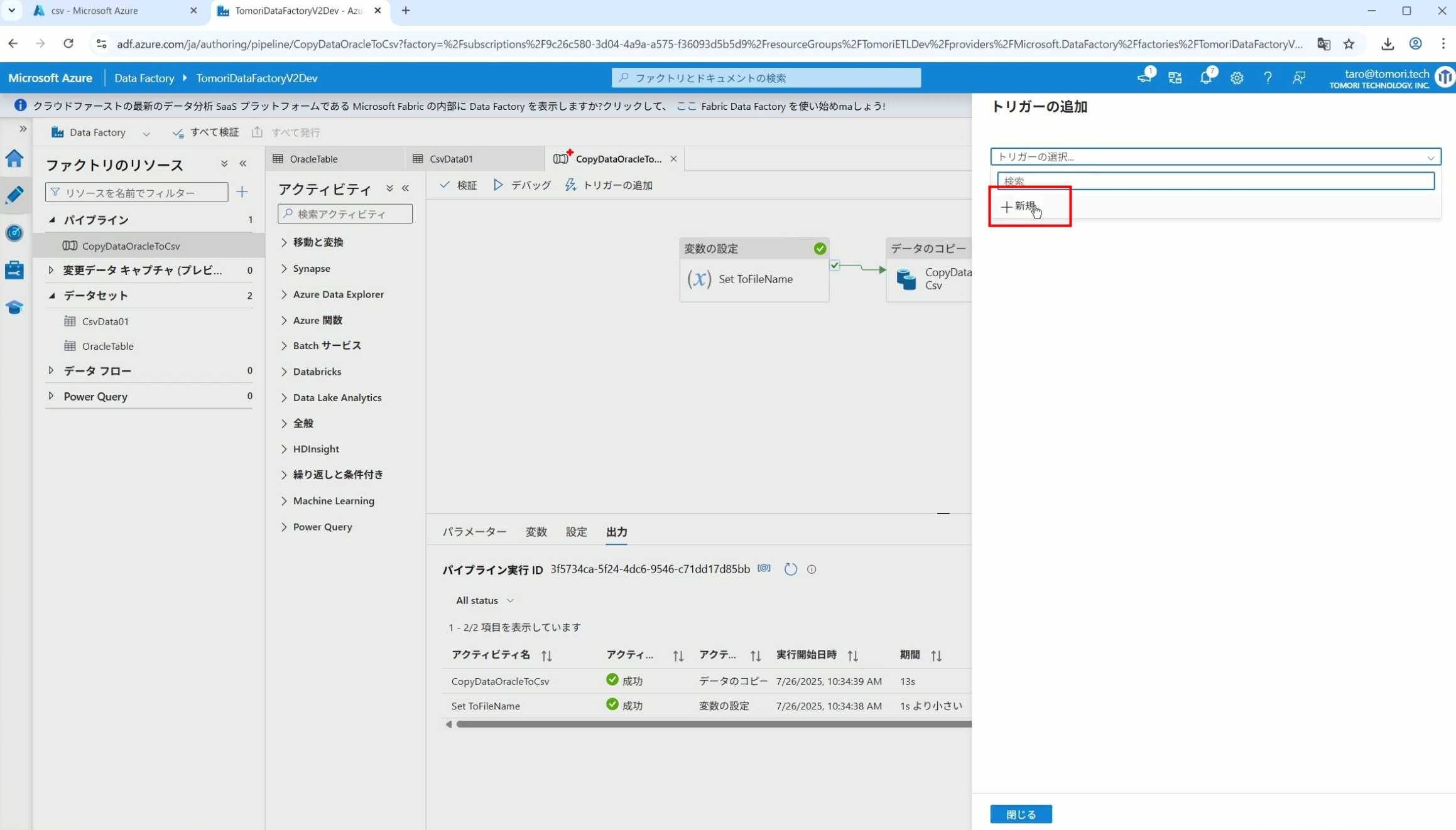 08_创建和使用ADF-03_在Pipeline中使用参数和变量以及Trigger执行 发布时间:2025-09-28 最后更新:2025-10-13 Azure 11 1、我们可以在Pipeline的参数中添加参数,以及设置参数的初始值,这样就可以通过参数来动态控制从哪个表获取数据,将数据保存成什么文件 2、Oracle的Dataset中也添加参数 3、Dataset中的Schema名和表名改用参数 4、点击参数即可使用(参数会跳到上面的编辑栏里) 5、同样,Storage的Dataset里也添加参数 6、保存文件的路径,文件名都设置为使用参数 7、在Copy Activity的Source里,将Pipeline的参数传递给Oracle的Dataset 8、设置好的样子 9、在Copy Activity的Sink中,将Pipeline的参数传递给Storage的Dataset 10、再以Debug模式运行Pipeline,这时就会出现参数框,因为我们设置了默认值,所以在里不需要再设置,如果没有设置默认值,可以在这里填入参数值 11、查看运行结果(成功) 12、修改默认参数值,再次运行 13、转到Storage,可以看到,文件以我们设置的参数值生成了 14、揭下来,我们给Pipeline添加一个变量 15、从左边的Activity一览里拖入设置变量的Activity 16、将两个Activity用绿线连起来(绿线代表前一个执行成功时,下一个接着执行,红线代表前一个执行失败时,下一个接着执行) 17、对设置变量的Activity进行设置,修改Activity的名字 18、对设置变量的Activity进行设置,给变量添加一个值,值可以是手写,也可以选择Pipeline的参数 19、当我们想在编辑框里手动编辑时,要符合代码的语法才行,如果不符合语法汇报错,比如想在变量后面加个「.csv」的话,不能直接添加 20、在Data Factory提供的函数中,可以选择concat,当鼠标停留在上面时,会显示函数的作用,concat是将多个字符串连接到一起 21、使用了concat之后的设置(符合语法,不会报错) 22、比如我们可以将Sink的文件名删掉 23、改用变量 24、设置好使用变量的样子 25、还可以对文件名进行编辑,比如加一个时间后缀,这里选择使用utcNow函数和formatDataTime函数,将当前时间转换为yyyyMMddHHmmss格式 26、再次执行Pipeline,执行成功后,在Storage里可以看到,文件以带有时间后缀的形式生成了 27、也可以使用convertTimeZone函数,将当前utc时间转换为日本时间 28、再次执行Pipeline,执行成功后,在Storage里可以看到,文件以带有时间后缀的形式生成了,并且时间是日本时间 29、发行Pipeline 30、确认Pipeline的修改点,没有问题的话点击发行 31、按照图示,可以点击Trigger执行→马上Trigger 32、弹出参数框,因为设置了默认参数,这里不需要再设置,点击OK 33、转到监视界面,可以看到Trigger执行的执行结果 34、点击Pipeline,进入到详细结果界面,可以查看Activity的输入和输出,比如点击输入按钮 35、可以看到输入的参数 36、点击输出按钮 37、可以查看输出的参数 38、在Copy Activity中,有一个眼镜按钮,点击眼镜按钮 39、可以查看数据复制的详细信息,读了多少行,读了多少Size,写了多少Size,用时多少等等 40、在Trigger执行中,还可以设置定期的自动执行 41、选择新建 42、可以选择按天,按小时,按分钟执行等 43、比如选择了按天的话,可以设置每天固定的时间自动执行