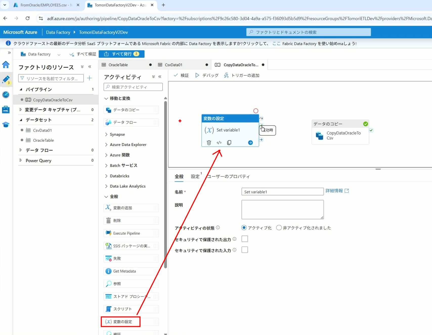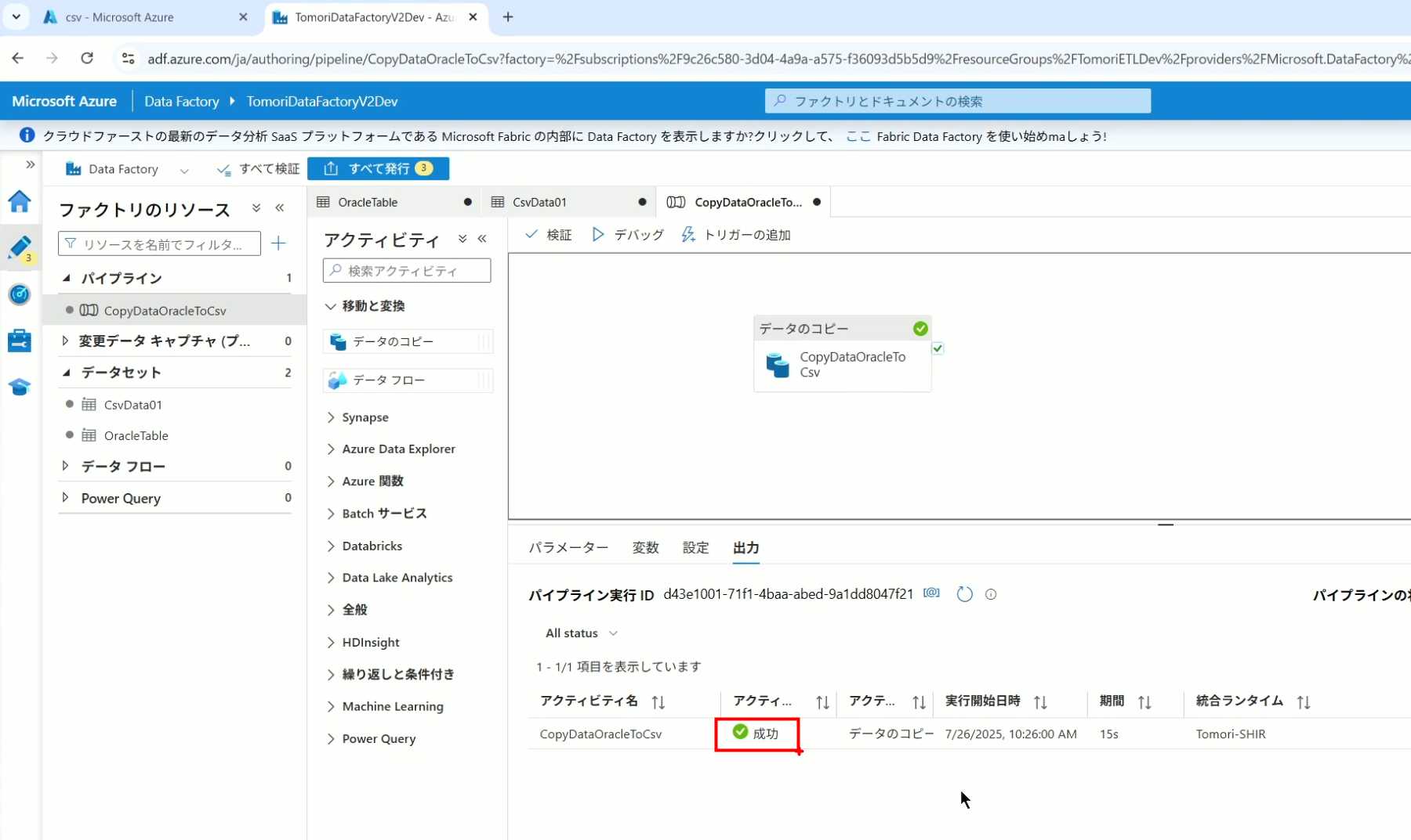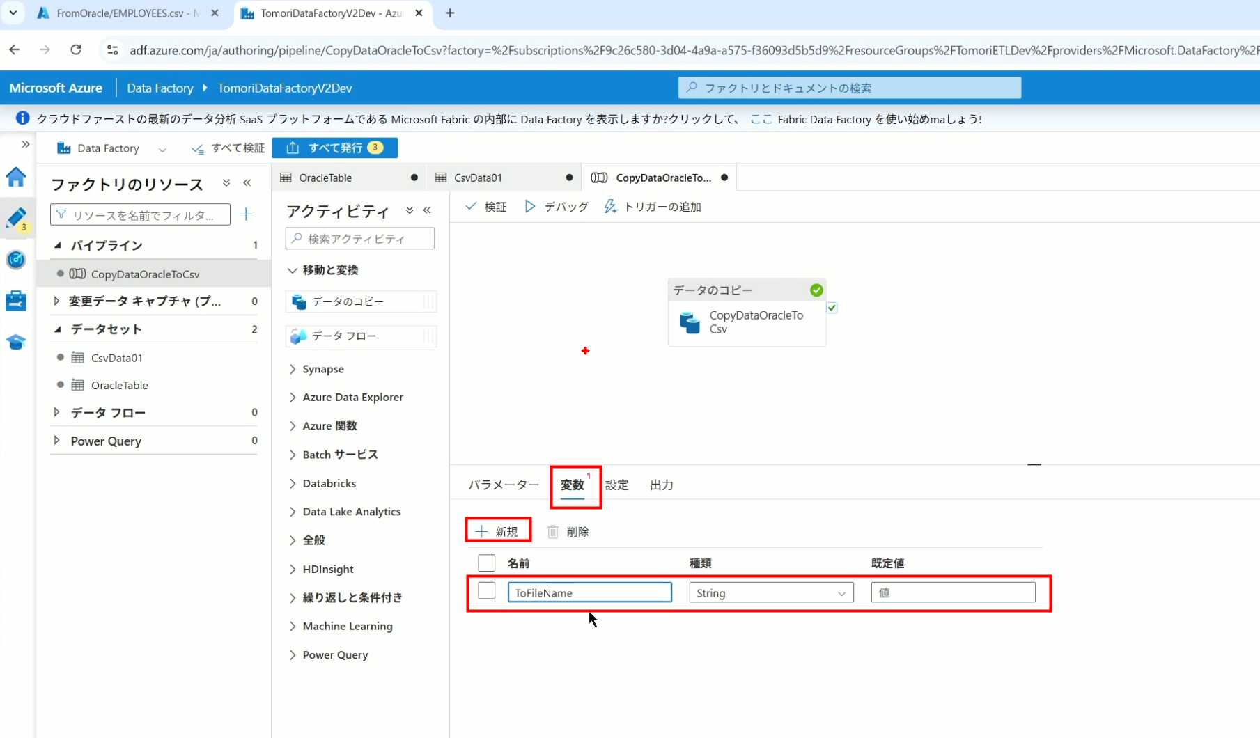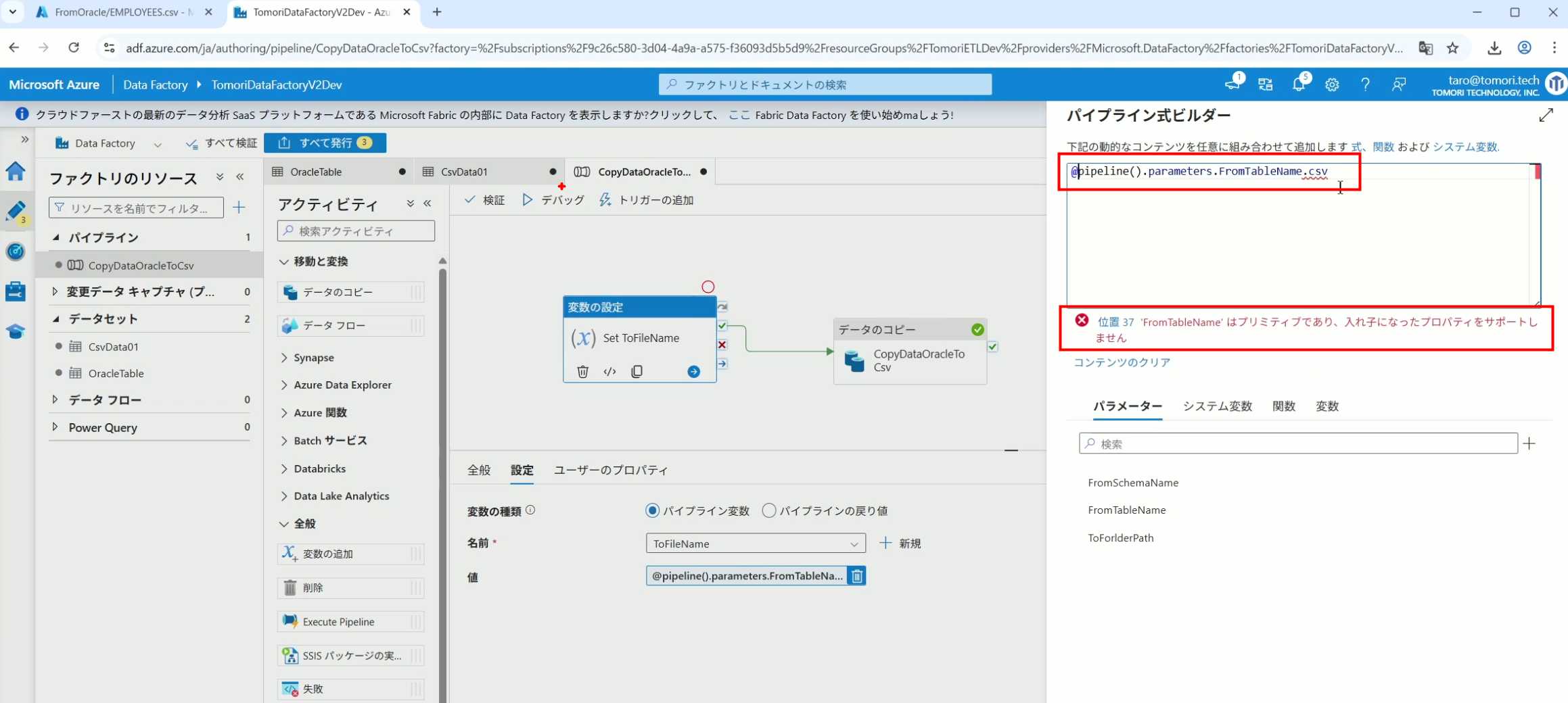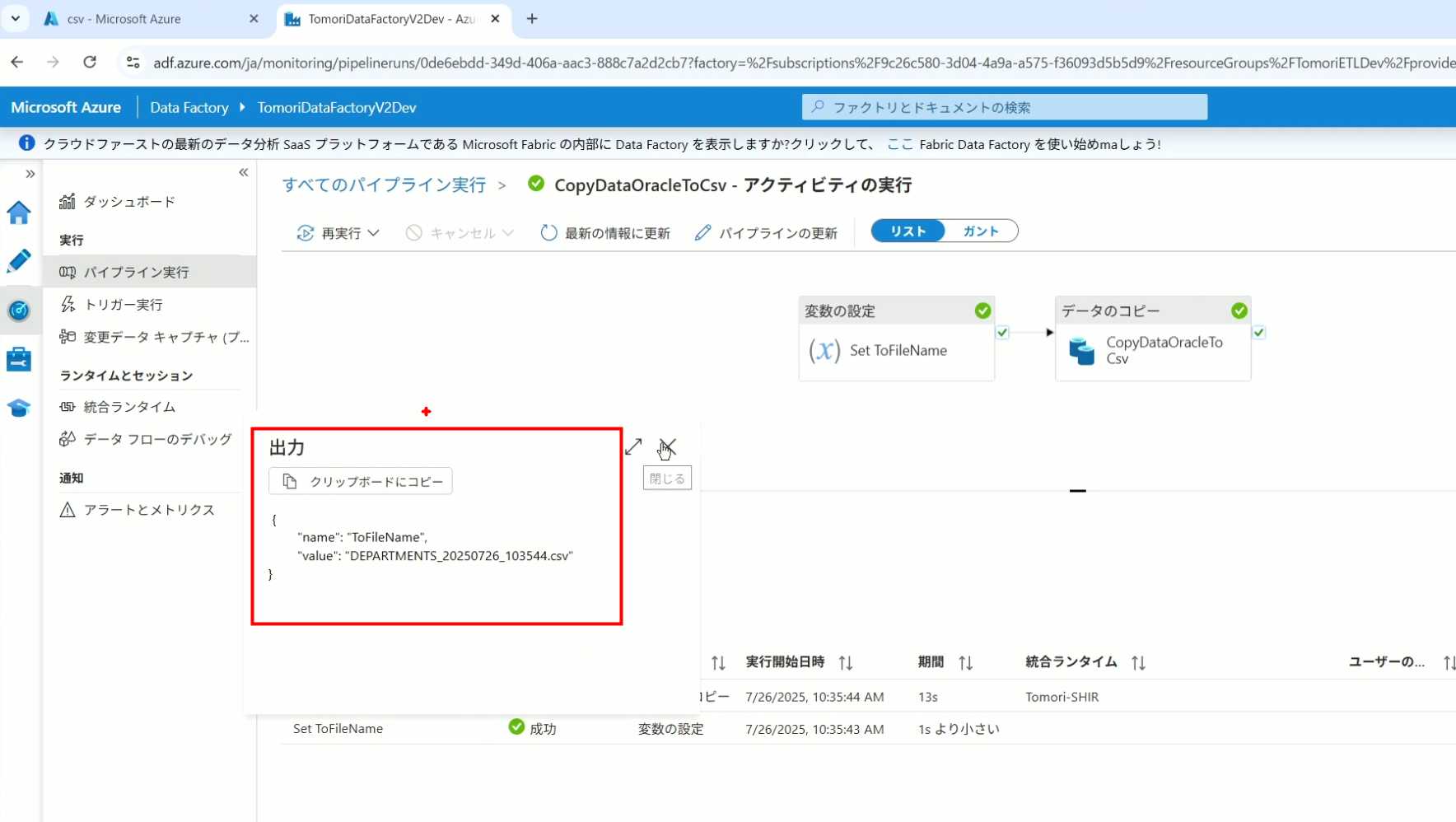 08_创建和使用ADF-03_在Pipeline中使用参数和变量以及Trigger执行 发布时间:2025-09-28 最后更新:2025-10-13 Azure 11 1、我们可以在Pipeline的参数中添加参数,以及设置参数的初始值,这样就可以通过参数来动态控制从哪个表获取数据,将数据保存成什么文件 2、Oracle的Dataset中也添加参数 3、Dataset中的Schema名和表名改用参数 4、点击参数即可使用(参数会跳到上面的编辑栏里) 5、同样,Storage的Dataset里也添加参数 6、保存文件的路径,文件名都设置为使用参数 7、在Copy Activity的Source里,将Pipeline的参数传递给Oracle的Dataset 8、设置好的样子 9、在Copy Activity的Sink中,将Pipeline的参数传递给Storage的Dataset 10、再以Debug模式运行Pipeline,这时就会出现参数框,因为我们设置了默认值,所以在里不需要再设置,如果没有设置默认值,可以在这里填入参数值 11、查看运行结果(成功) 12、修改默认参数值,再次运行 13、转到Storage,可以看到,文件以我们设置的参数值生成了 14、揭下来,我们给Pipeline添加一个变量 15、从左边的Activity一览里拖入设置变量的Activity 16、将两个Activity用绿线连起来(绿线代表前一个执行成功时,下一个接着执行,红线代表前一个执行失败时,下一个接着执行) 17、对设置变量的Activity进行设置,修改Activity的名字 18、对设置变量的Activity进行设置,给变量添加一个值,值可以是手写,也可以选择Pipeline的参数 19、当我们想在编辑框里手动编辑时,要符合代码的语法才行,如果不符合语法汇报错,比如想在变量后面加个「.csv」的话,不能直接添加 20、在Data Factory提供的函数中,可以选择concat,当鼠标停留在上面时,会显示函数的作用,concat是将多个字符串连接到一起 21、使用了concat之后的设置(符合语法,不会报错) 22、比如我们可以将Sink的文件名删掉 23、改用变量 24、设置好使用变量的样子 25、还可以对文件名进行编辑,比如加一个时间后缀,这里选择使用utcNow函数和formatDataTime函数,将当前时间转换为yyyyMMddHHmmss格式 26、再次执行Pipeline,执行成功后,在Storage里可以看到,文件以带有时间后缀的形式生成了 27、也可以使用convertTimeZone函数,将当前utc时间转换为日本时间 28、再次执行Pipeline,执行成功后,在Storage里可以看到,文件以带有时间后缀的形式生成了,并且时间是日本时间 29、发行Pipeline 30、确认Pipeline的修改点,没有问题的话点击发行 31、按照图示,可以点击Trigger执行→马上Trigger 32、弹出参数框,因为设置了默认参数,这里不需要再设置,点击OK 33、转到监视界面,可以看到Trigger执行的执行结果 34、点击Pipeline,进入到详细结果界面,可以查看Activity的输入和输出,比如点击输入按钮 35、可以看到输入的参数 36、点击输出按钮 37、可以查看输出的参数 38、在Copy Activity中,有一个眼镜按钮,点击眼镜按钮 39、可以查看数据复制的详细信息,读了多少行,读了多少Size,写了多少Size,用时多少等等 40、在Trigger执行中,还可以设置定期的自动执行 41、选择新建 42、可以选择按天,按小时,按分钟执行等 43、比如选择了按天的话,可以设置每天固定的时间自动执行