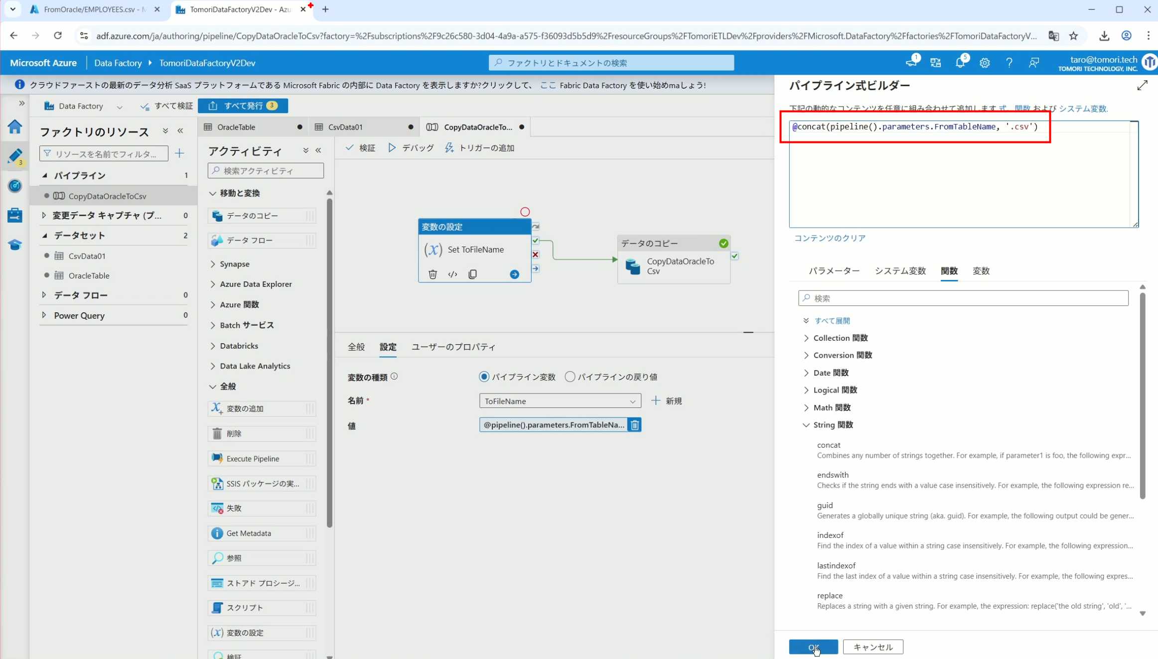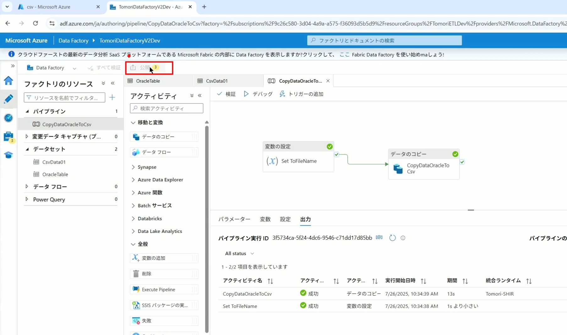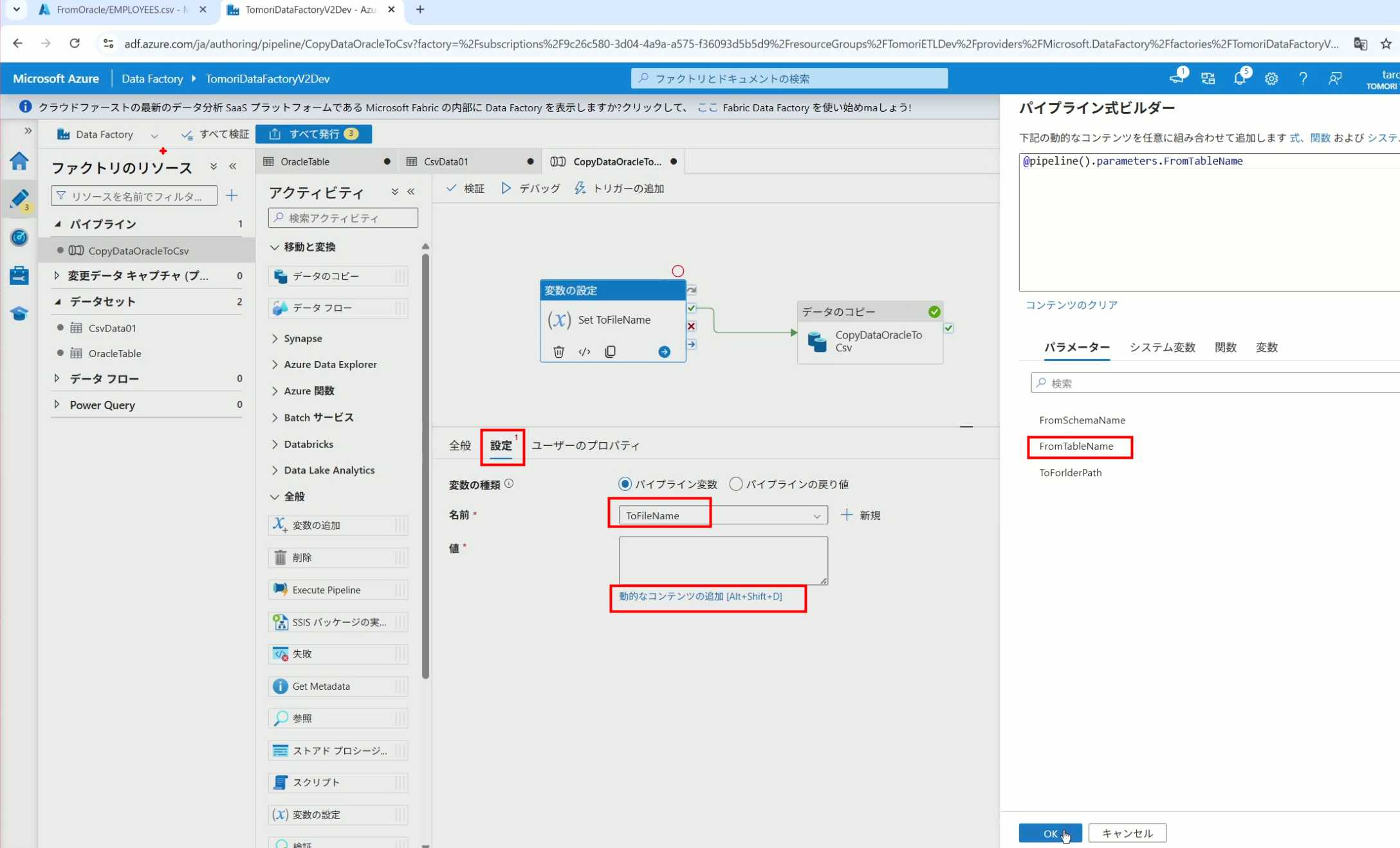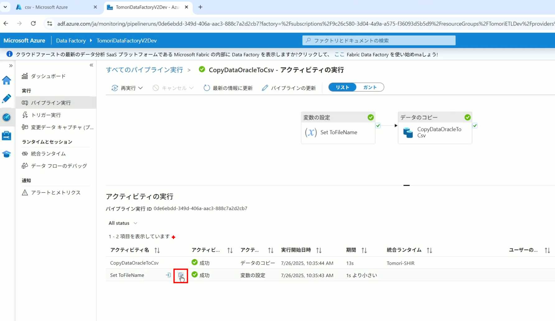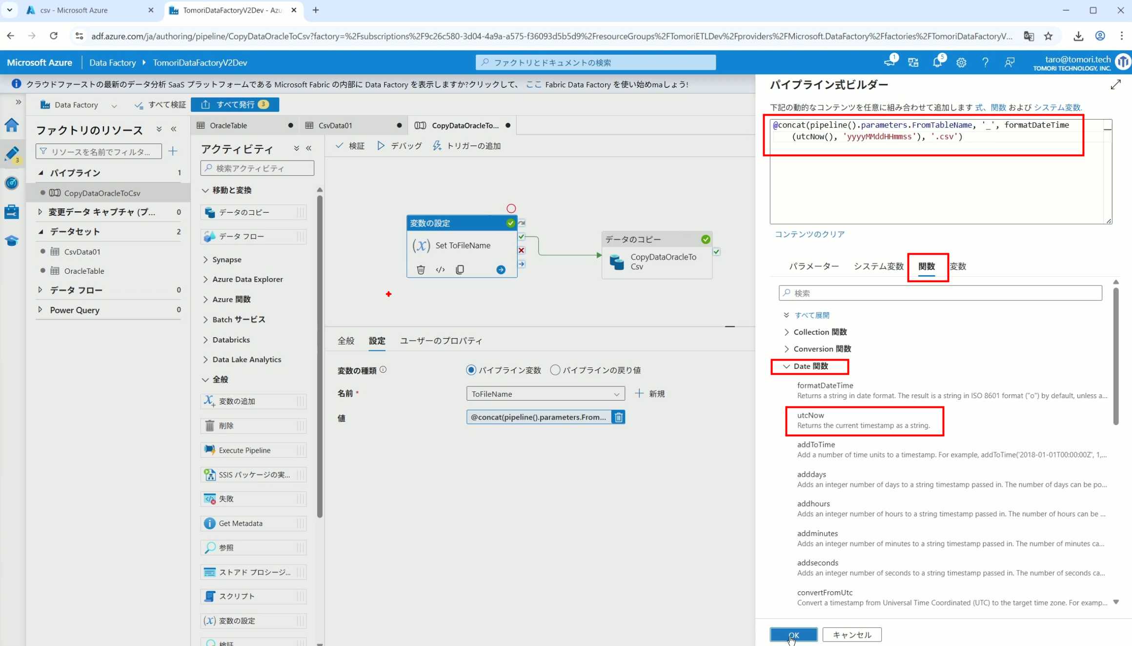 08_创建和使用ADF-03_在Pipeline中使用参数和变量以及Trigger执行 发布时间:2025-09-28 最后更新:2025-10-13 Azure 11 1、我们可以在Pipeline的参数中添加参数,以及设置参数的初始值,这样就可以通过参数来动态控制从哪个表获取数据,将数据保存成什么文件 2、Oracle的Dataset中也添加参数 3、Dataset中的Schema名和表名改用参数 4、点击参数即可使用(参数会跳到上面的编辑栏里) 5、同样,Storage的Dataset里也添加参数 6、保存文件的路径,文件名都设置为使用参数 7、在Copy Activity的Source里,将Pipeline的参数传递给Oracle的Dataset 8、设置好的样子 9、在Copy Activity的Sink中,将Pipeline的参数传递给Storage的Dataset 10、再以Debug模式运行Pipeline,这时就会出现参数框,因为我们设置了默认值,所以在里不需要再设置,如果没有设置默认值,可以在这里填入参数值 11、查看运行结果(成功) 12、修改默认参数值,再次运行 13、转到Storage,可以看到,文件以我们设置的参数值生成了 14、揭下来,我们给Pipeline添加一个变量 15、从左边的Activity一览里拖入设置变量的Activity 16、将两个Activity用绿线连起来(绿线代表前一个执行成功时,下一个接着执行,红线代表前一个执行失败时,下一个接着执行) 17、对设置变量的Activity进行设置,修改Activity的名字 18、对设置变量的Activity进行设置,给变量添加一个值,值可以是手写,也可以选择Pipeline的参数 19、当我们想在编辑框里手动编辑时,要符合代码的语法才行,如果不符合语法汇报错,比如想在变量后面加个「.csv」的话,不能直接添加 20、在Data Factory提供的函数中,可以选择concat,当鼠标停留在上面时,会显示函数的作用,concat是将多个字符串连接到一起 21、使用了concat之后的设置(符合语法,不会报错) 22、比如我们可以将Sink的文件名删掉 23、改用变量 24、设置好使用变量的样子 25、还可以对文件名进行编辑,比如加一个时间后缀,这里选择使用utcNow函数和formatDataTime函数,将当前时间转换为yyyyMMddHHmmss格式 26、再次执行Pipeline,执行成功后,在Storage里可以看到,文件以带有时间后缀的形式生成了 27、也可以使用convertTimeZone函数,将当前utc时间转换为日本时间 28、再次执行Pipeline,执行成功后,在Storage里可以看到,文件以带有时间后缀的形式生成了,并且时间是日本时间 29、发行Pipeline 30、确认Pipeline的修改点,没有问题的话点击发行 31、按照图示,可以点击Trigger执行→马上Trigger 32、弹出参数框,因为设置了默认参数,这里不需要再设置,点击OK 33、转到监视界面,可以看到Trigger执行的执行结果 34、点击Pipeline,进入到详细结果界面,可以查看Activity的输入和输出,比如点击输入按钮 35、可以看到输入的参数 36、点击输出按钮 37、可以查看输出的参数 38、在Copy Activity中,有一个眼镜按钮,点击眼镜按钮 39、可以查看数据复制的详细信息,读了多少行,读了多少Size,写了多少Size,用时多少等等 40、在Trigger执行中,还可以设置定期的自动执行 41、选择新建 42、可以选择按天,按小时,按分钟执行等 43、比如选择了按天的话,可以设置每天固定的时间自动执行