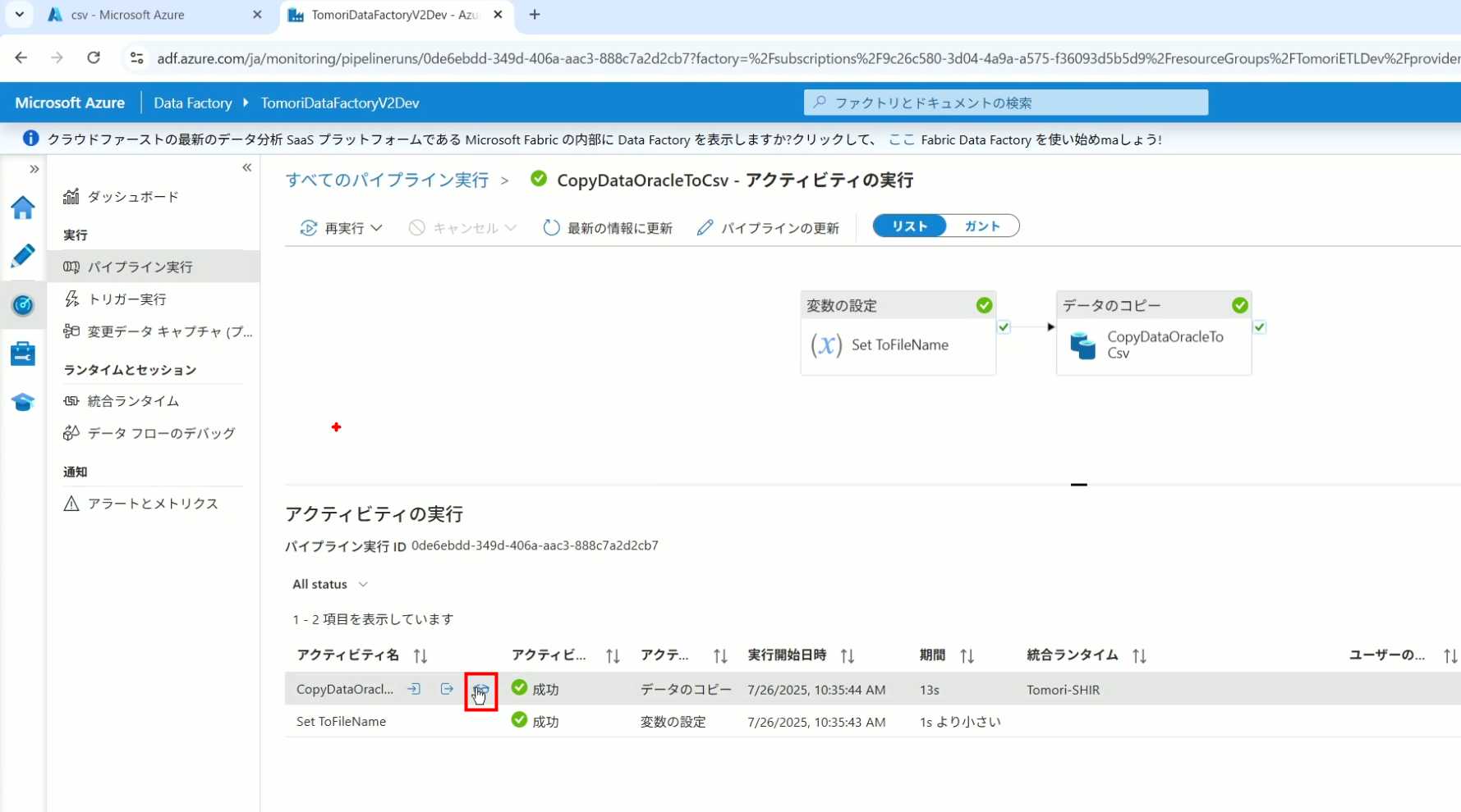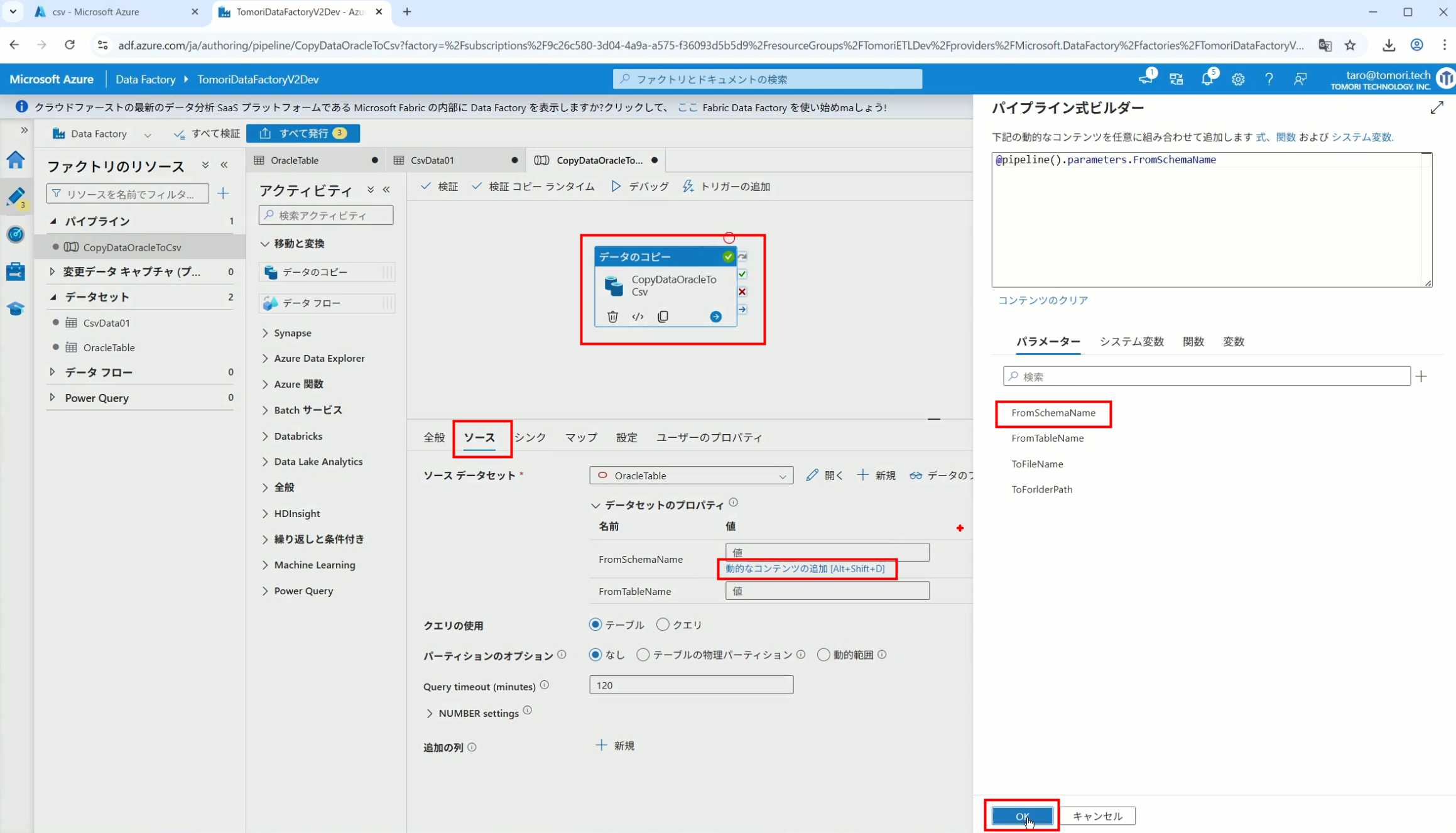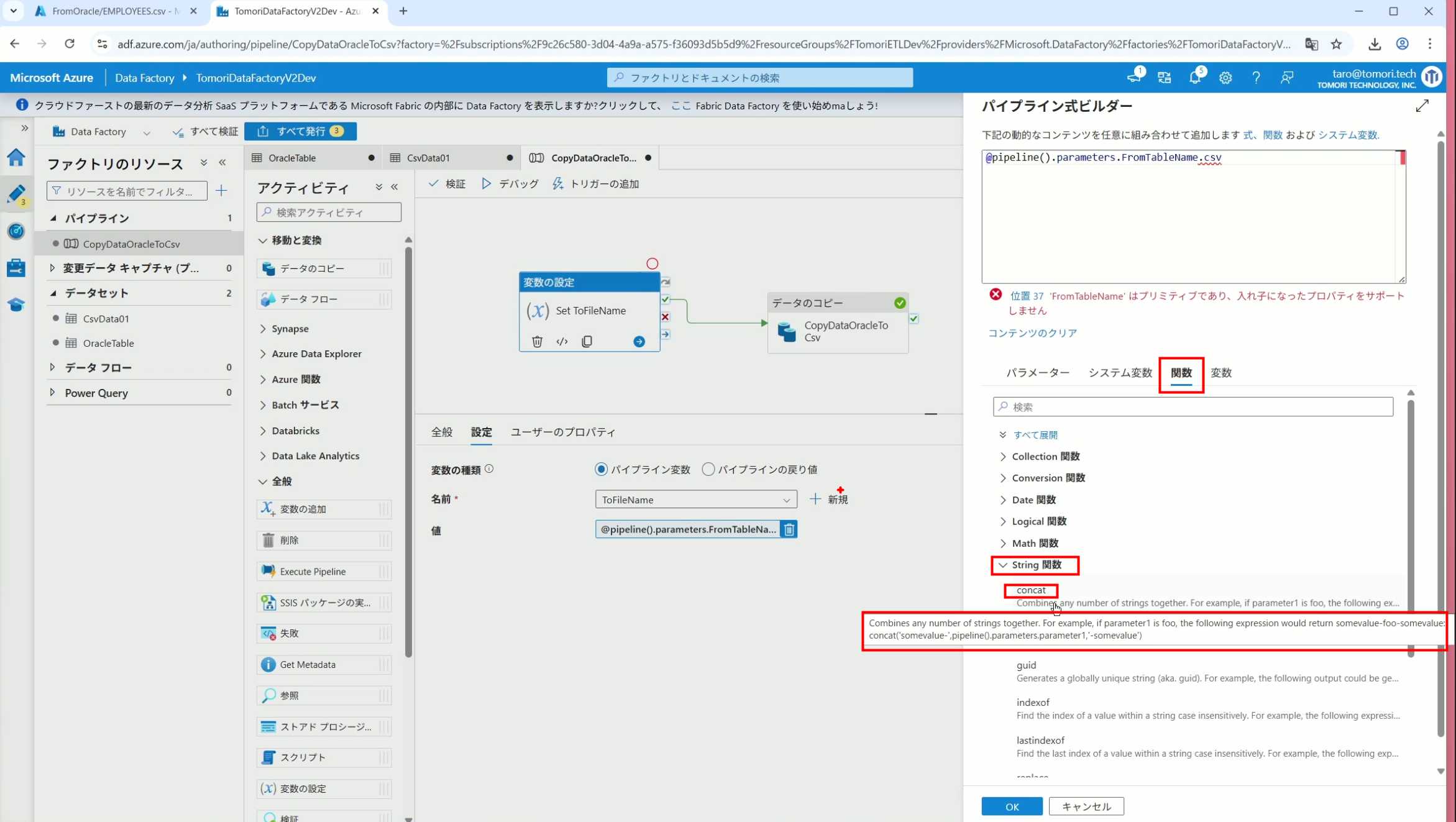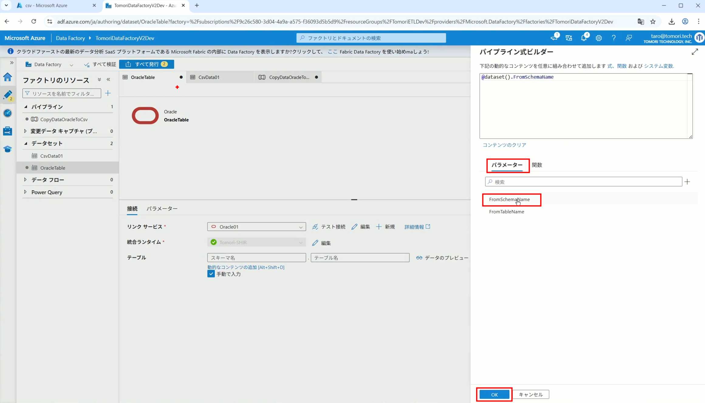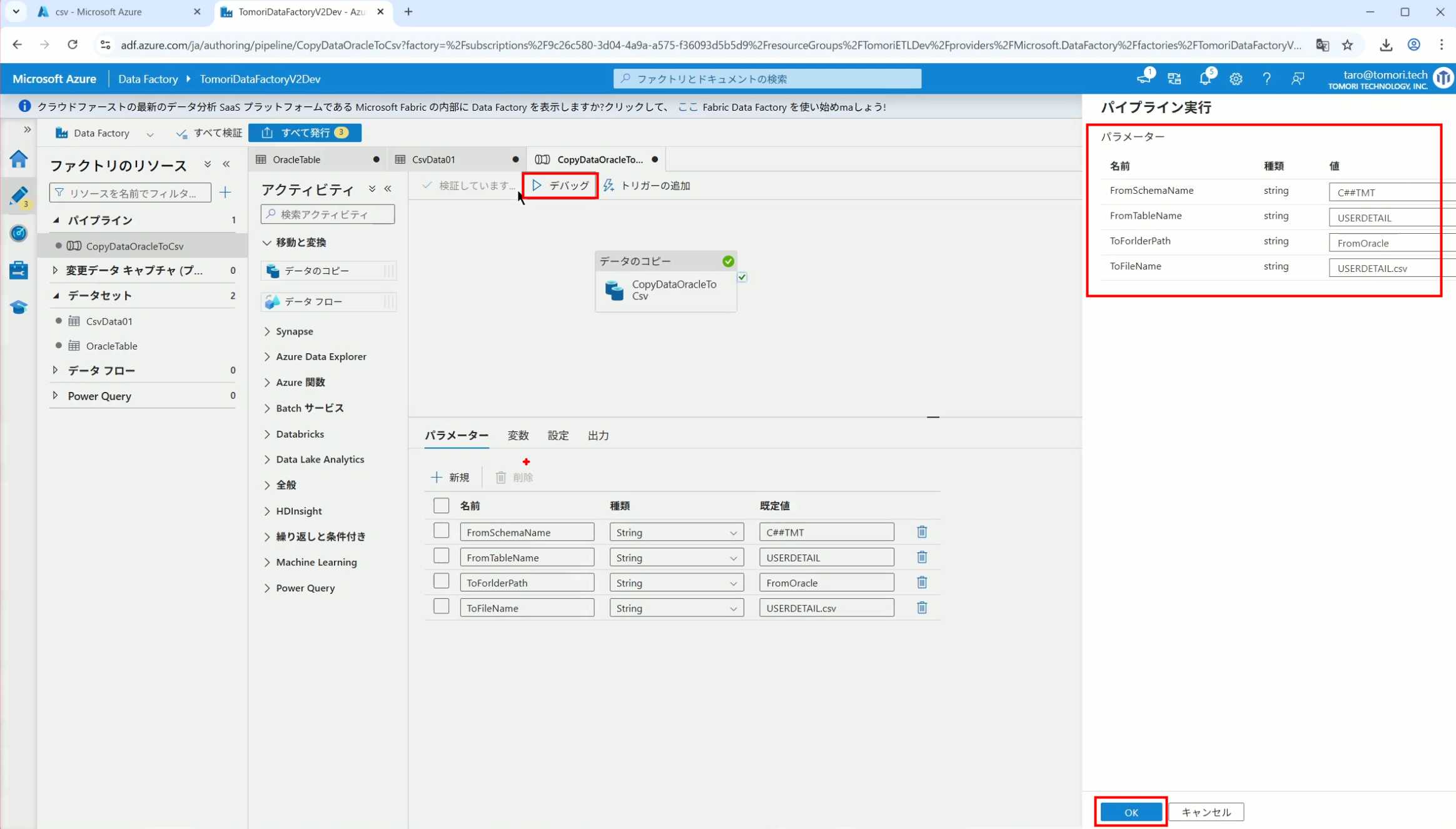 08_创建和使用ADF-03_在Pipeline中使用参数和变量以及Trigger执行 发布时间:2025-09-28 最后更新:2025-10-13 Azure 11 1、我们可以在Pipeline的参数中添加参数,以及设置参数的初始值,这样就可以通过参数来动态控制从哪个表获取数据,将数据保存成什么文件 2、Oracle的Dataset中也添加参数 3、Dataset中的Schema名和表名改用参数 4、点击参数即可使用(参数会跳到上面的编辑栏里) 5、同样,Storage的Dataset里也添加参数 6、保存文件的路径,文件名都设置为使用参数 7、在Copy Activity的Source里,将Pipeline的参数传递给Oracle的Dataset 8、设置好的样子 9、在Copy Activity的Sink中,将Pipeline的参数传递给Storage的Dataset 10、再以Debug模式运行Pipeline,这时就会出现参数框,因为我们设置了默认值,所以在里不需要再设置,如果没有设置默认值,可以在这里填入参数值 11、查看运行结果(成功) 12、修改默认参数值,再次运行 13、转到Storage,可以看到,文件以我们设置的参数值生成了 14、揭下来,我们给Pipeline添加一个变量 15、从左边的Activity一览里拖入设置变量的Activity 16、将两个Activity用绿线连起来(绿线代表前一个执行成功时,下一个接着执行,红线代表前一个执行失败时,下一个接着执行) 17、对设置变量的Activity进行设置,修改Activity的名字 18、对设置变量的Activity进行设置,给变量添加一个值,值可以是手写,也可以选择Pipeline的参数 19、当我们想在编辑框里手动编辑时,要符合代码的语法才行,如果不符合语法汇报错,比如想在变量后面加个「.csv」的话,不能直接添加 20、在Data Factory提供的函数中,可以选择concat,当鼠标停留在上面时,会显示函数的作用,concat是将多个字符串连接到一起 21、使用了concat之后的设置(符合语法,不会报错) 22、比如我们可以将Sink的文件名删掉 23、改用变量 24、设置好使用变量的样子 25、还可以对文件名进行编辑,比如加一个时间后缀,这里选择使用utcNow函数和formatDataTime函数,将当前时间转换为yyyyMMddHHmmss格式 26、再次执行Pipeline,执行成功后,在Storage里可以看到,文件以带有时间后缀的形式生成了 27、也可以使用convertTimeZone函数,将当前utc时间转换为日本时间 28、再次执行Pipeline,执行成功后,在Storage里可以看到,文件以带有时间后缀的形式生成了,并且时间是日本时间 29、发行Pipeline 30、确认Pipeline的修改点,没有问题的话点击发行 31、按照图示,可以点击Trigger执行→马上Trigger 32、弹出参数框,因为设置了默认参数,这里不需要再设置,点击OK 33、转到监视界面,可以看到Trigger执行的执行结果 34、点击Pipeline,进入到详细结果界面,可以查看Activity的输入和输出,比如点击输入按钮 35、可以看到输入的参数 36、点击输出按钮 37、可以查看输出的参数 38、在Copy Activity中,有一个眼镜按钮,点击眼镜按钮 39、可以查看数据复制的详细信息,读了多少行,读了多少Size,写了多少Size,用时多少等等 40、在Trigger执行中,还可以设置定期的自动执行 41、选择新建 42、可以选择按天,按小时,按分钟执行等 43、比如选择了按天的话,可以设置每天固定的时间自动执行