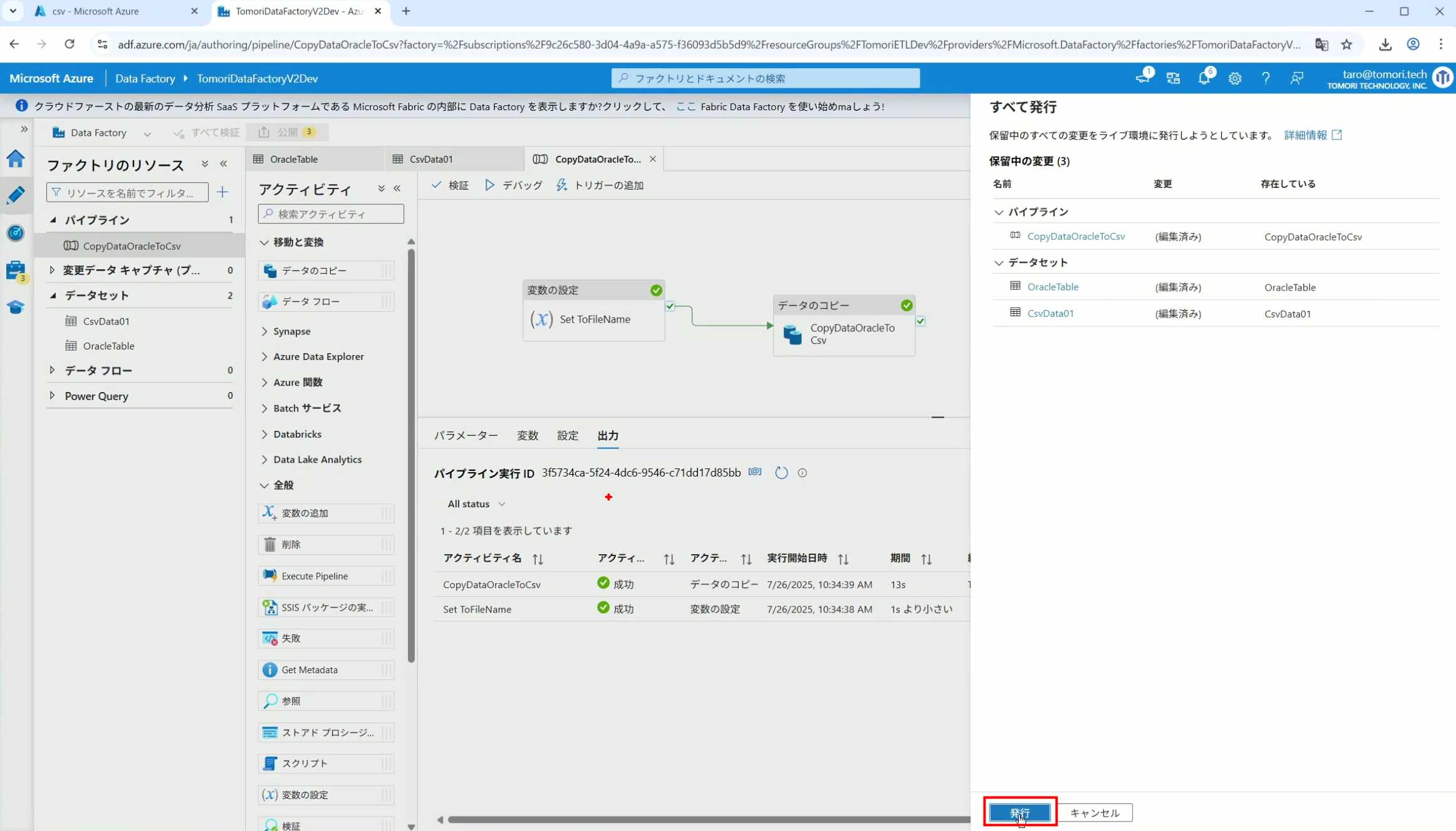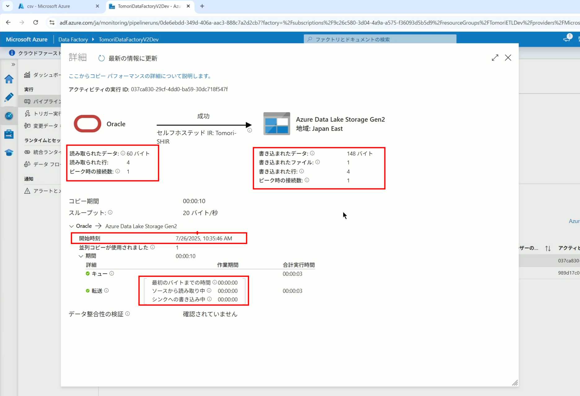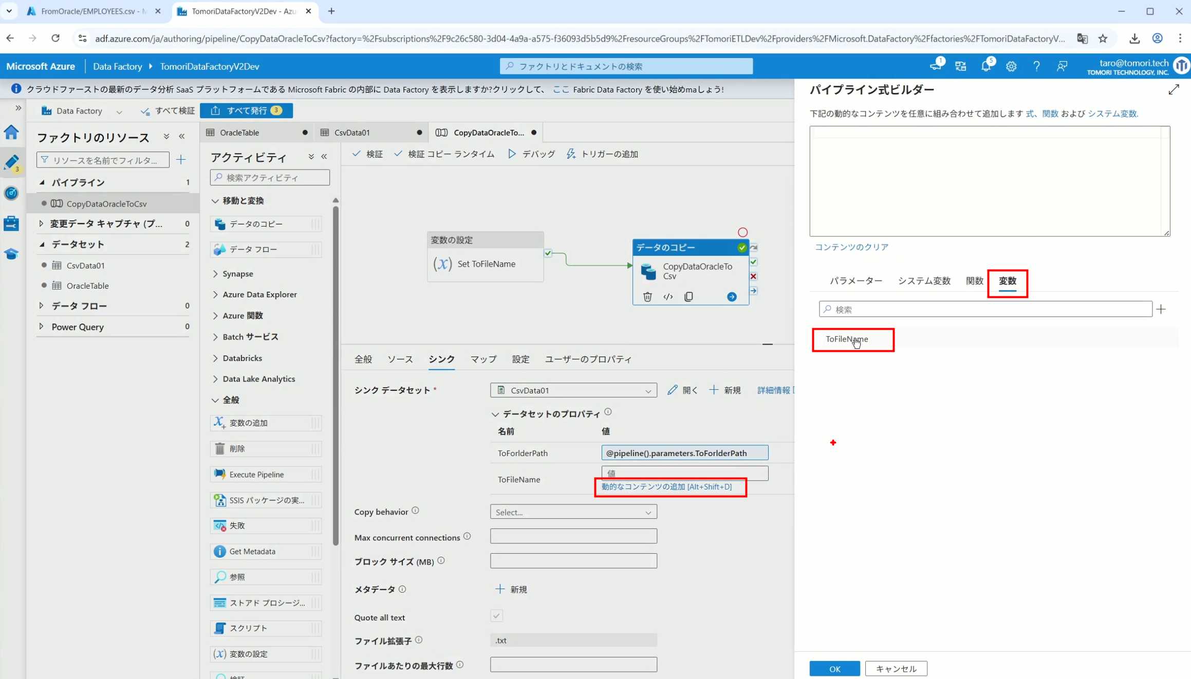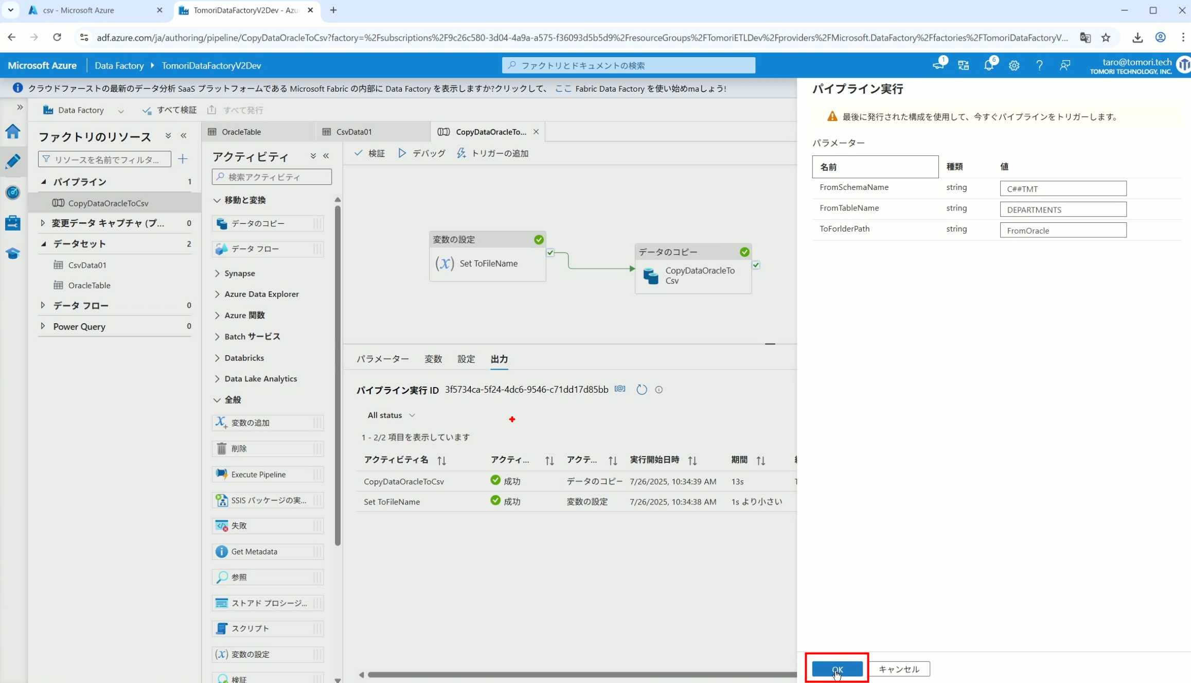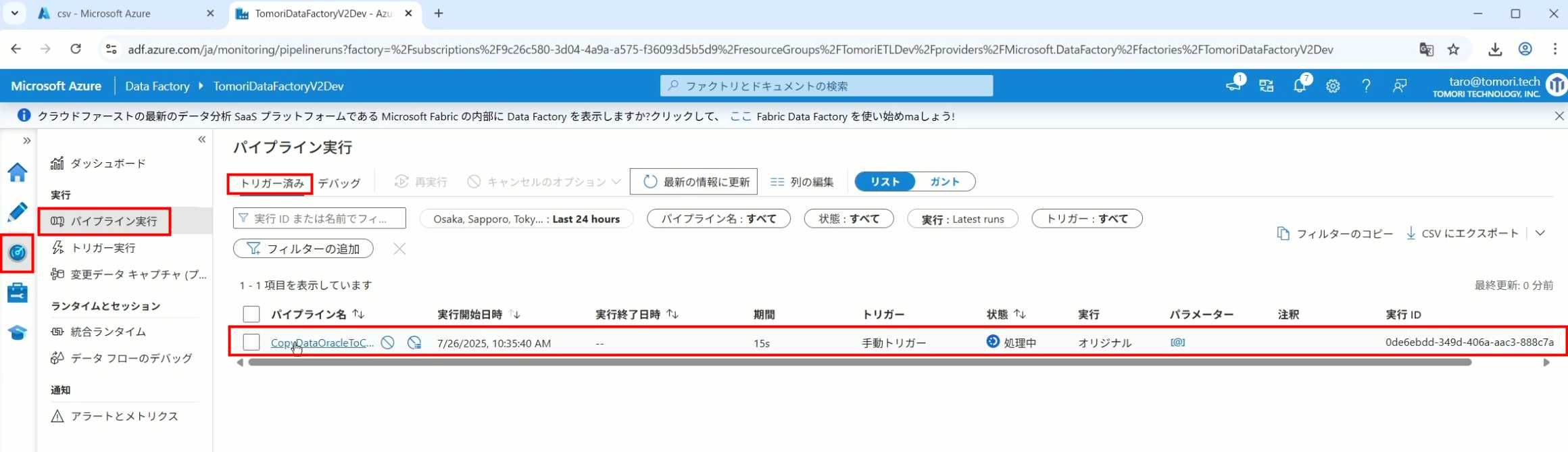 08_创建和使用ADF-03_在Pipeline中使用参数和变量以及Trigger执行 发布时间:2025-09-28 最后更新:2025-10-13 Azure 11 1、我们可以在Pipeline的参数中添加参数,以及设置参数的初始值,这样就可以通过参数来动态控制从哪个表获取数据,将数据保存成什么文件 2、Oracle的Dataset中也添加参数 3、Dataset中的Schema名和表名改用参数 4、点击参数即可使用(参数会跳到上面的编辑栏里) 5、同样,Storage的Dataset里也添加参数 6、保存文件的路径,文件名都设置为使用参数 7、在Copy Activity的Source里,将Pipeline的参数传递给Oracle的Dataset 8、设置好的样子 9、在Copy Activity的Sink中,将Pipeline的参数传递给Storage的Dataset 10、再以Debug模式运行Pipeline,这时就会出现参数框,因为我们设置了默认值,所以在里不需要再设置,如果没有设置默认值,可以在这里填入参数值 11、查看运行结果(成功) 12、修改默认参数值,再次运行 13、转到Storage,可以看到,文件以我们设置的参数值生成了 14、揭下来,我们给Pipeline添加一个变量 15、从左边的Activity一览里拖入设置变量的Activity 16、将两个Activity用绿线连起来(绿线代表前一个执行成功时,下一个接着执行,红线代表前一个执行失败时,下一个接着执行) 17、对设置变量的Activity进行设置,修改Activity的名字 18、对设置变量的Activity进行设置,给变量添加一个值,值可以是手写,也可以选择Pipeline的参数 19、当我们想在编辑框里手动编辑时,要符合代码的语法才行,如果不符合语法汇报错,比如想在变量后面加个「.csv」的话,不能直接添加 20、在Data Factory提供的函数中,可以选择concat,当鼠标停留在上面时,会显示函数的作用,concat是将多个字符串连接到一起 21、使用了concat之后的设置(符合语法,不会报错) 22、比如我们可以将Sink的文件名删掉 23、改用变量 24、设置好使用变量的样子 25、还可以对文件名进行编辑,比如加一个时间后缀,这里选择使用utcNow函数和formatDataTime函数,将当前时间转换为yyyyMMddHHmmss格式 26、再次执行Pipeline,执行成功后,在Storage里可以看到,文件以带有时间后缀的形式生成了 27、也可以使用convertTimeZone函数,将当前utc时间转换为日本时间 28、再次执行Pipeline,执行成功后,在Storage里可以看到,文件以带有时间后缀的形式生成了,并且时间是日本时间 29、发行Pipeline 30、确认Pipeline的修改点,没有问题的话点击发行 31、按照图示,可以点击Trigger执行→马上Trigger 32、弹出参数框,因为设置了默认参数,这里不需要再设置,点击OK 33、转到监视界面,可以看到Trigger执行的执行结果 34、点击Pipeline,进入到详细结果界面,可以查看Activity的输入和输出,比如点击输入按钮 35、可以看到输入的参数 36、点击输出按钮 37、可以查看输出的参数 38、在Copy Activity中,有一个眼镜按钮,点击眼镜按钮 39、可以查看数据复制的详细信息,读了多少行,读了多少Size,写了多少Size,用时多少等等 40、在Trigger执行中,还可以设置定期的自动执行 41、选择新建 42、可以选择按天,按小时,按分钟执行等 43、比如选择了按天的话,可以设置每天固定的时间自动执行