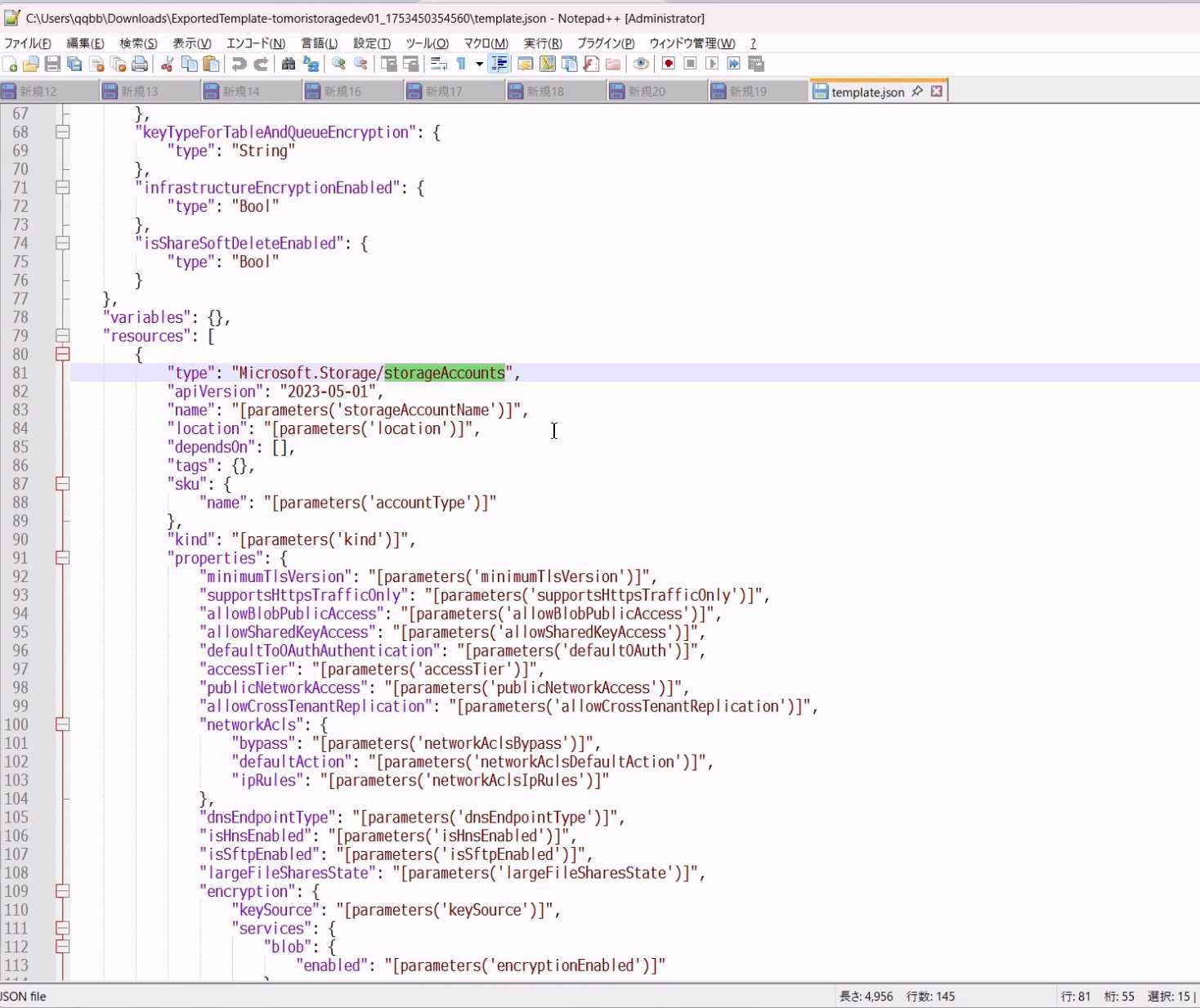 32、打开json文件后,可以看到文件里有Storage Account相关的信息