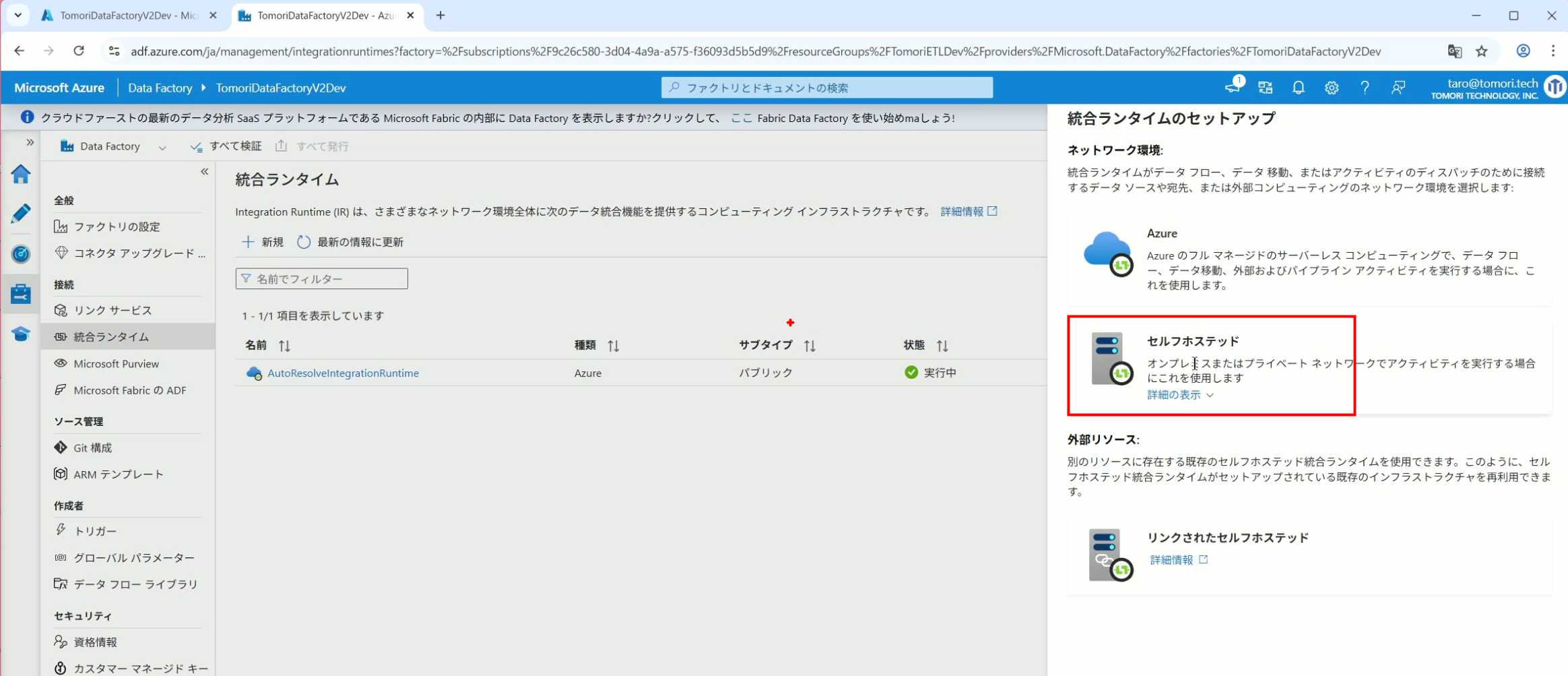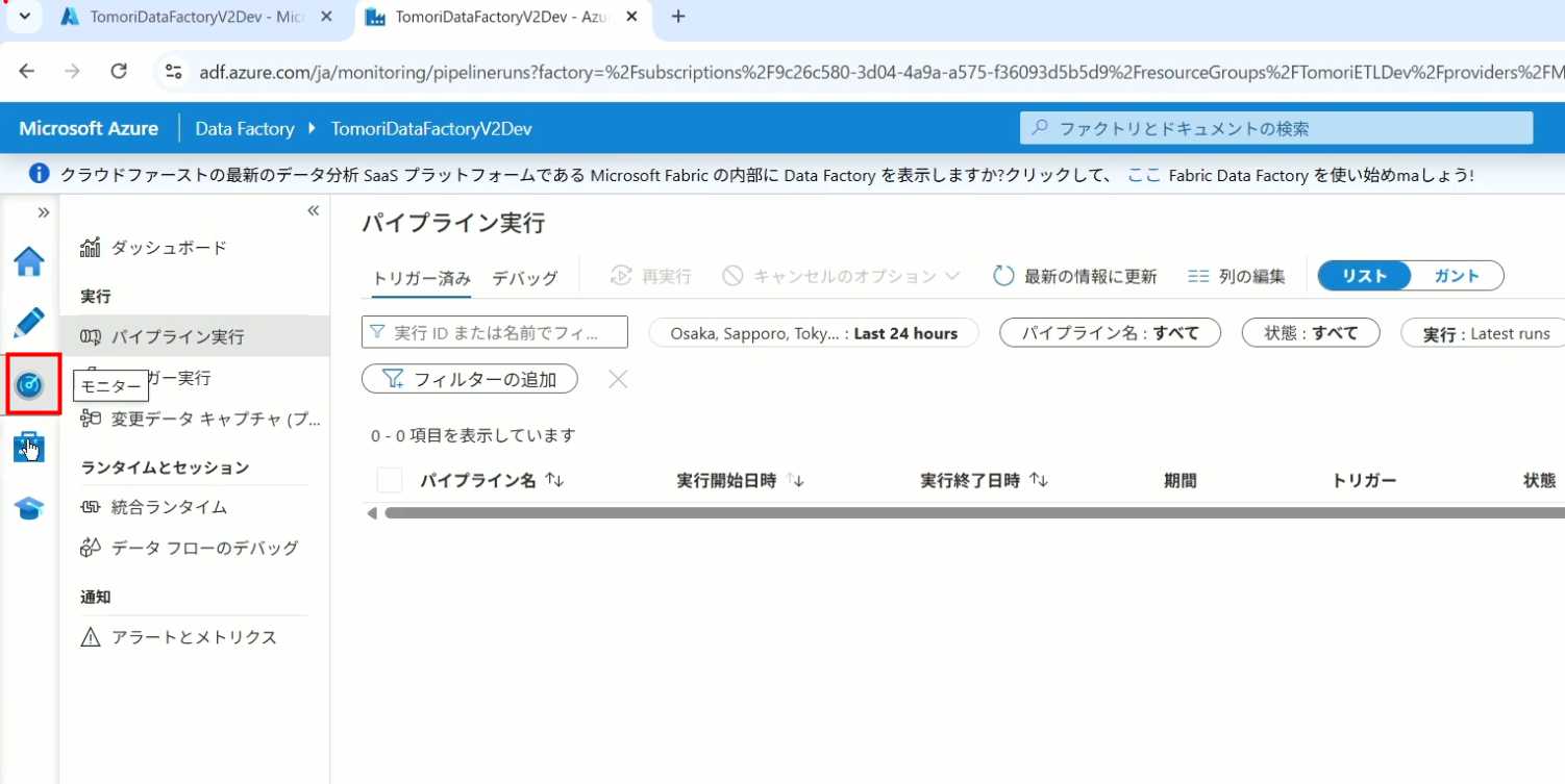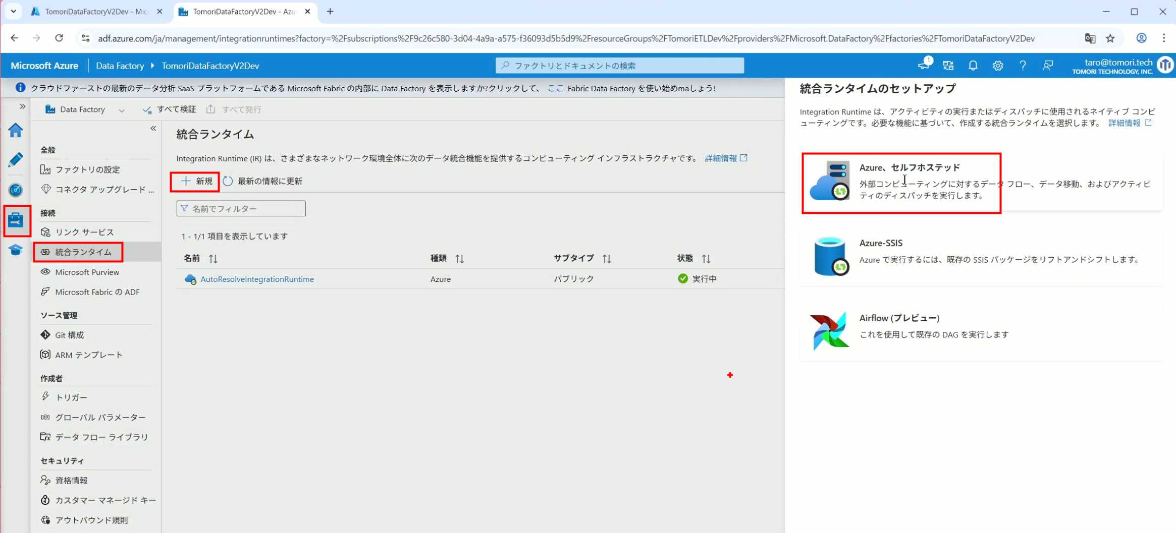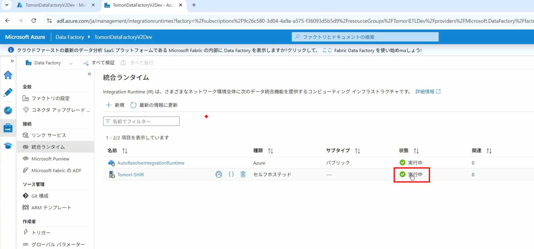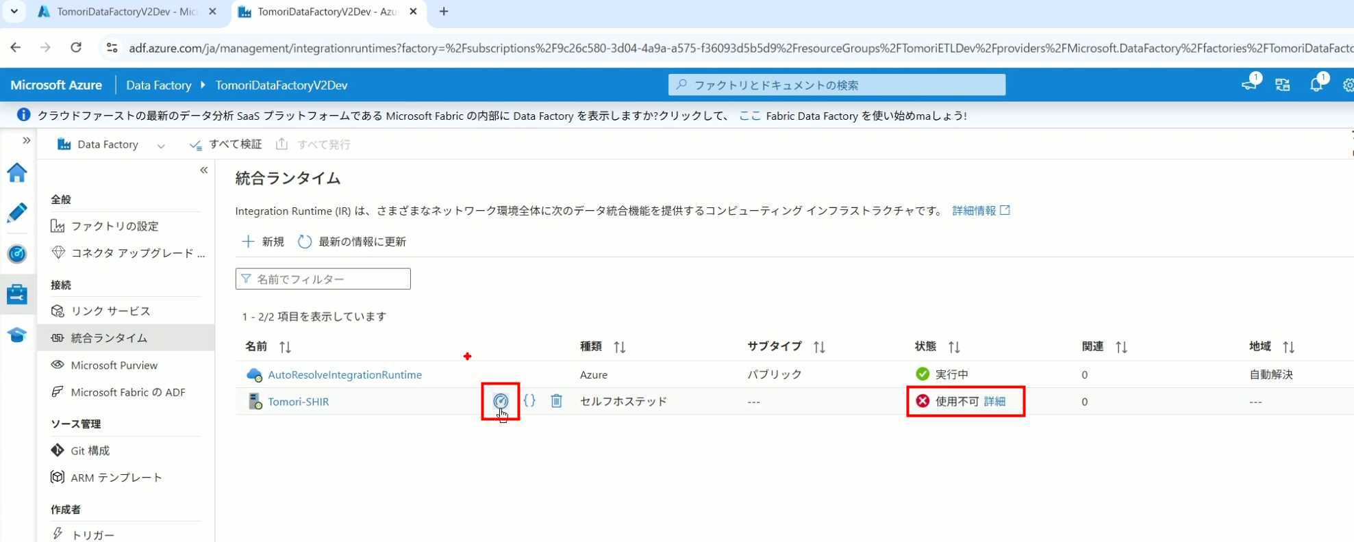 06_创建和使用ADF-01_创建ADF和Runtime 发布时间:2025-09-28 最后更新:2025-09-29 Azure 16 Data Factory:数据工厂 1、数据工厂示意图 2、数据工厂中的Pipeline示意图 3、在搜索栏搜索数据工厂 4、点击作成 5、可以在这里新建资源组(使用既有的资源组也可以) 6、填写数据工厂的名字,选择区域,这里选择东日本 7、勾选稍后设置Git 8、这里选择公网访问即可 9、然后就一直下一步,直到创建 10、创建成功的界面 11、进入数据工厂的话,可以从资源组进入 12、点击画面中间的启动按钮 13、这时会跳出新的窗口,进入数据工厂的工作区 14、初识工作区,这里是创建Pipeline等资源的窗口(Pipeline是数据工厂中处理执行的单位) 15、这里是监看窗口,可以监看Pipeline的执行状态 16、这里是一些设置和管理窗口 17、我们先进入设置和管理窗口,创建自己的Runtime(运行时),按画面的按钮点击 18、然后选择セルフホステッド(自托管),因为使用微软提供的AutoResolveIntegrationRuntime会比较贵 19、取个名字 20、然后作成即可(右上角显示了作成成功) 21、这时我们回到管理界面,发现这个自托管运行时是不可用的,这时因为还没有给他绑定实际的运行环境 22、按照这个按钮点击进入编辑界面 23、编辑界面里有下载运行时程序的链接,点击这个链接 24、跳转到了微软的运行时下载界面,在要安装运行时的机器上下载这个安装文件,练习的话,可以先在自己的本机上安装 25、点击下载,下载最新版 26、下载完成后,打开安装文件安装,一直下一步即可 27、安装完成后是这样的界面 28、将自托管运行时上显示的这串数字复制粘贴到运行时的设置窗口,然后点注册 29、一直下一步,直到完了 30、之后就可以启动运行时 31、启动后的界面,上面显示的更新问题他会自动更新,先无需理会 32、这时回到数据工厂的管理界面,发现运行时变为可用了,这样就完成了数据工厂与实际运行程序的机器的绑定,在数据工程中运行的程序,后台实际都由其绑定的机器来执行 33、如果进入Node界面,可以看到绑定的机器