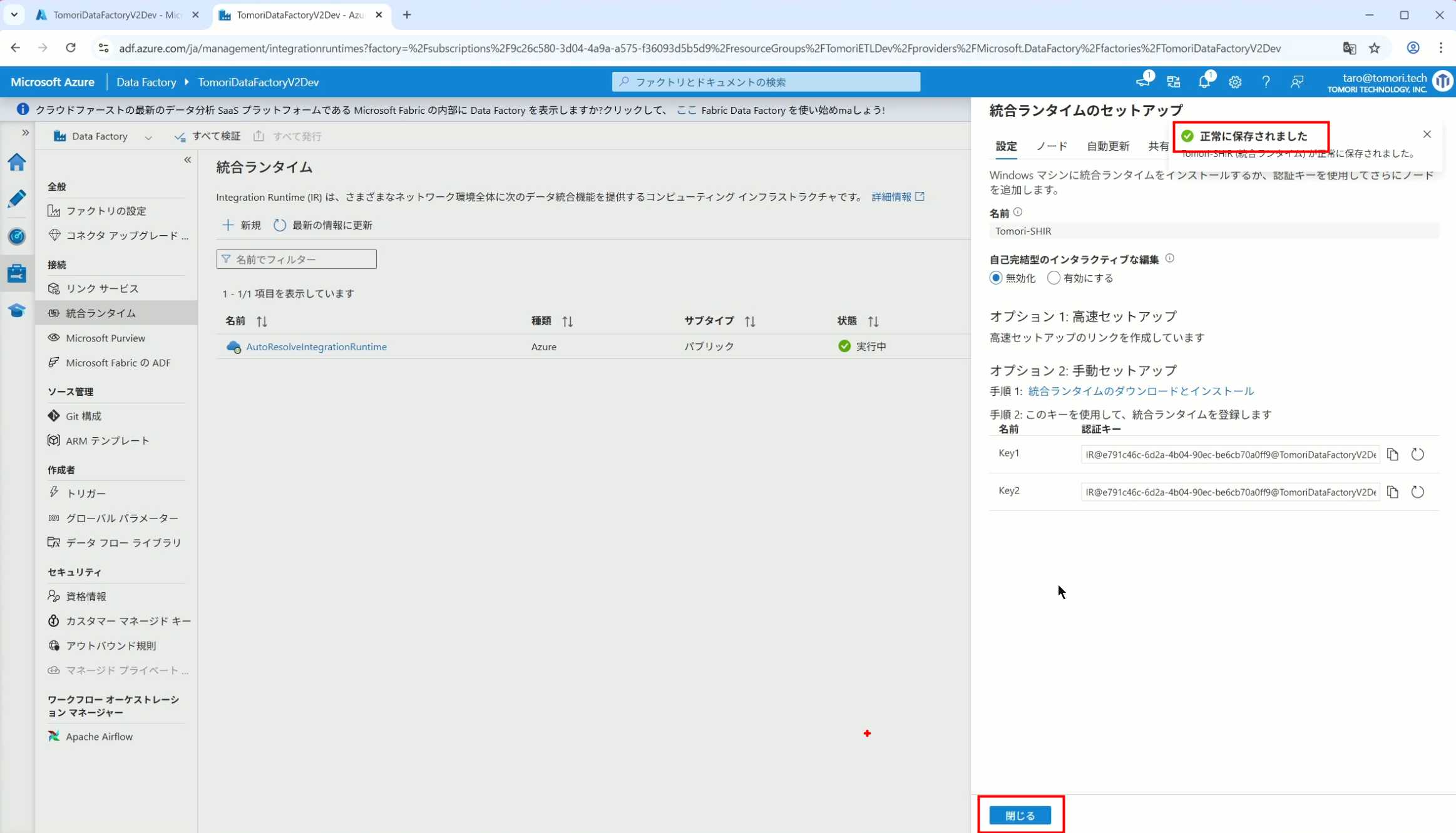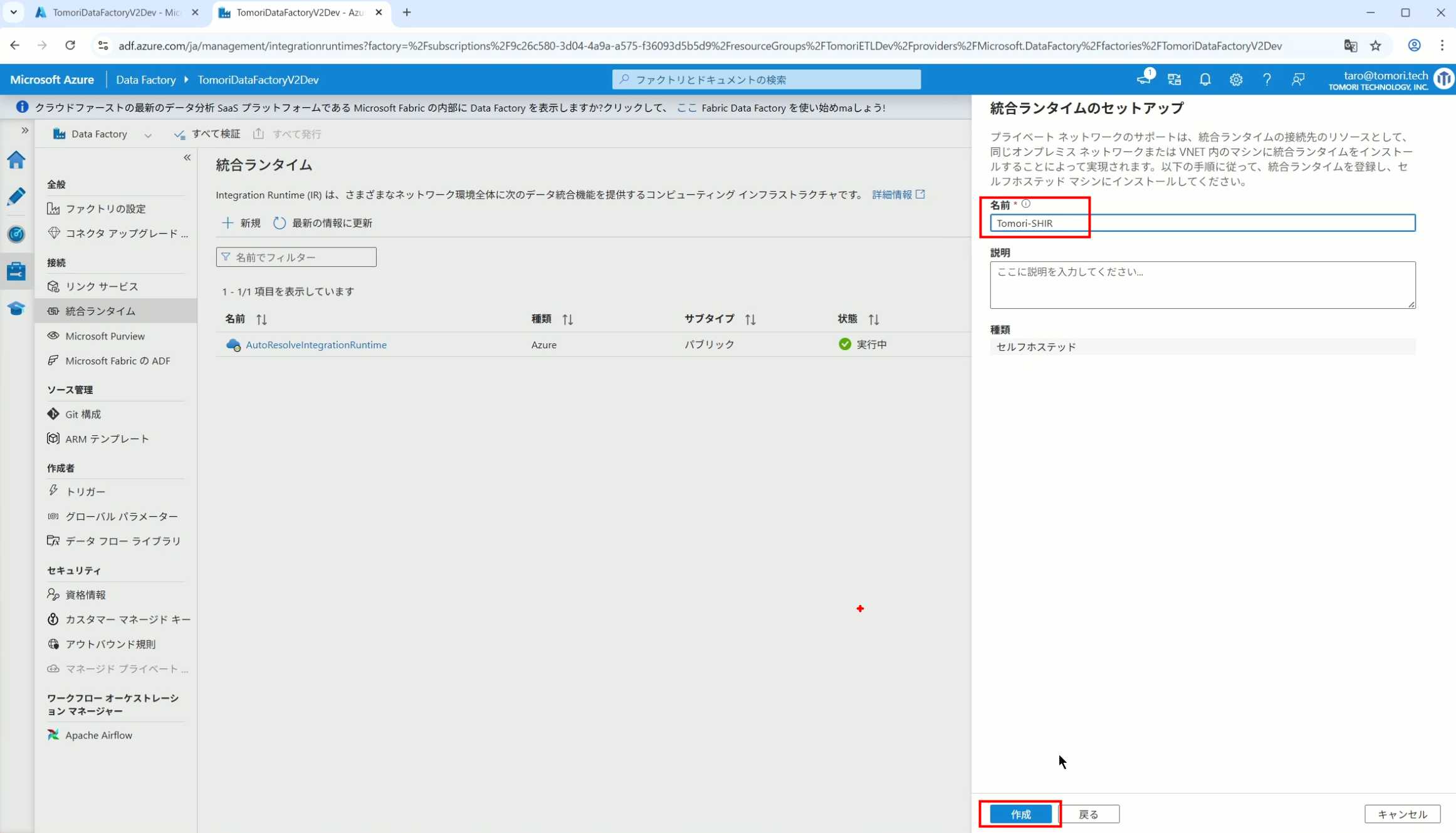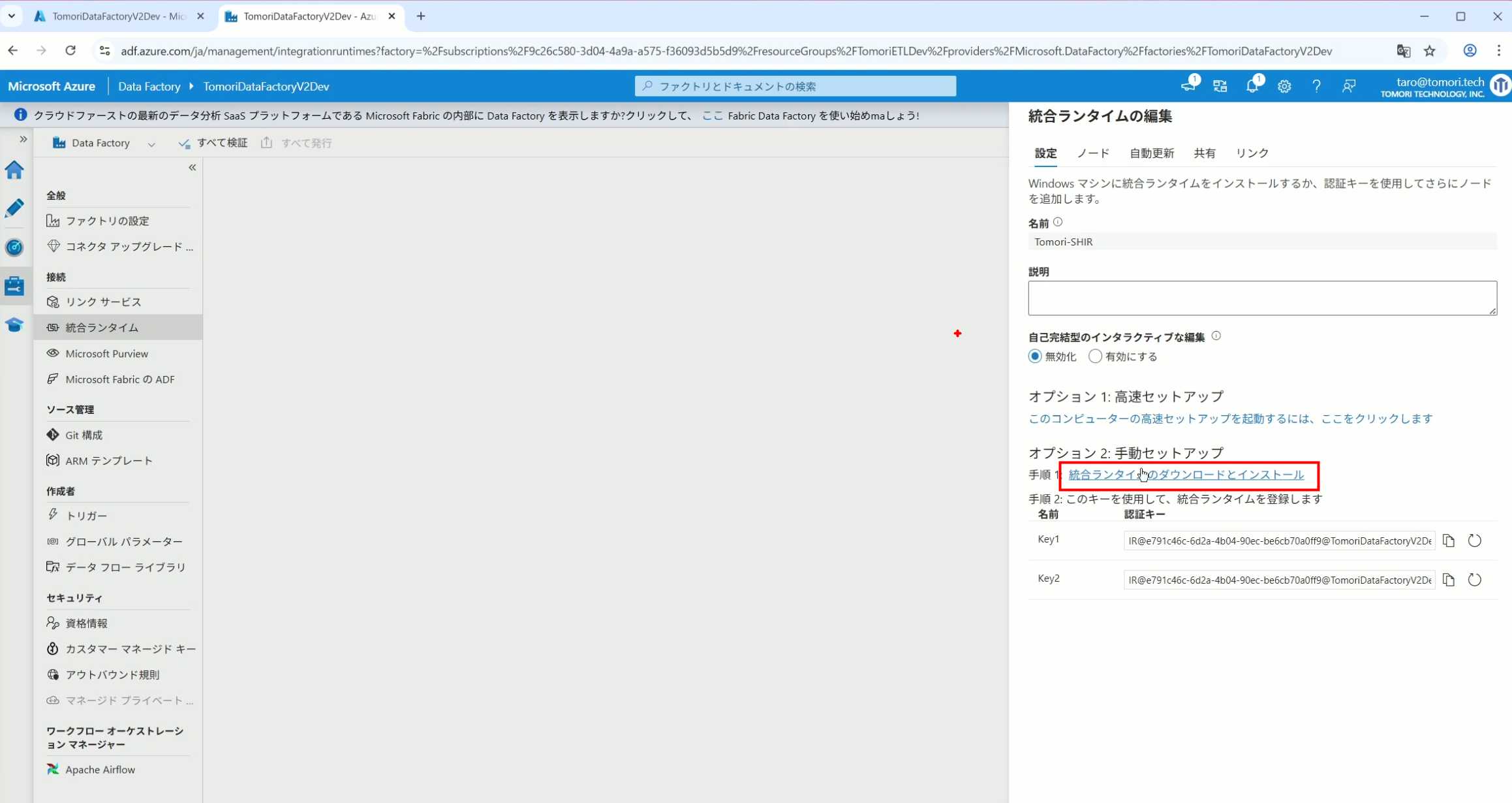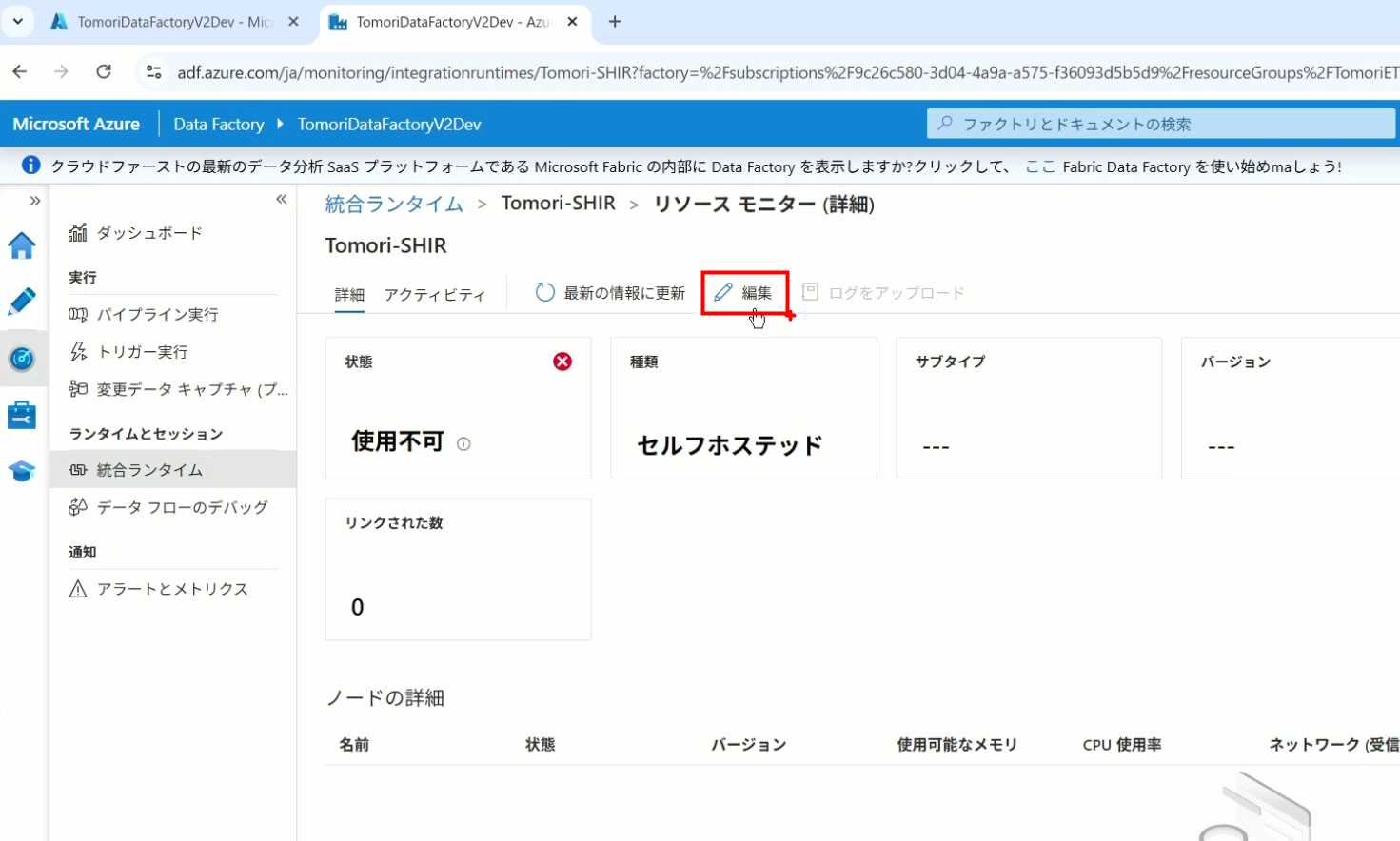 06_创建和使用ADF-01_创建ADF和Runtime 发布时间:2025-09-28 最后更新:2025-09-29 Azure 16 Data Factory:数据工厂 1、数据工厂示意图 2、数据工厂中的Pipeline示意图 3、在搜索栏搜索数据工厂 4、点击作成 5、可以在这里新建资源组(使用既有的资源组也可以) 6、填写数据工厂的名字,选择区域,这里选择东日本 7、勾选稍后设置Git 8、这里选择公网访问即可 9、然后就一直下一步,直到创建 10、创建成功的界面 11、进入数据工厂的话,可以从资源组进入 12、点击画面中间的启动按钮 13、这时会跳出新的窗口,进入数据工厂的工作区 14、初识工作区,这里是创建Pipeline等资源的窗口(Pipeline是数据工厂中处理执行的单位) 15、这里是监看窗口,可以监看Pipeline的执行状态 16、这里是一些设置和管理窗口 17、我们先进入设置和管理窗口,创建自己的Runtime(运行时),按画面的按钮点击 18、然后选择セルフホステッド(自托管),因为使用微软提供的AutoResolveIntegrationRuntime会比较贵 19、取个名字 20、然后作成即可(右上角显示了作成成功) 21、这时我们回到管理界面,发现这个自托管运行时是不可用的,这时因为还没有给他绑定实际的运行环境 22、按照这个按钮点击进入编辑界面 23、编辑界面里有下载运行时程序的链接,点击这个链接 24、跳转到了微软的运行时下载界面,在要安装运行时的机器上下载这个安装文件,练习的话,可以先在自己的本机上安装 25、点击下载,下载最新版 26、下载完成后,打开安装文件安装,一直下一步即可 27、安装完成后是这样的界面 28、将自托管运行时上显示的这串数字复制粘贴到运行时的设置窗口,然后点注册 29、一直下一步,直到完了 30、之后就可以启动运行时 31、启动后的界面,上面显示的更新问题他会自动更新,先无需理会 32、这时回到数据工厂的管理界面,发现运行时变为可用了,这样就完成了数据工厂与实际运行程序的机器的绑定,在数据工程中运行的程序,后台实际都由其绑定的机器来执行 33、如果进入Node界面,可以看到绑定的机器